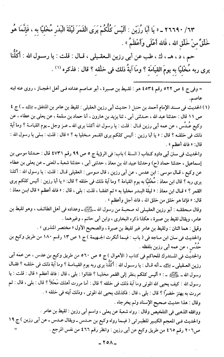 63/ 26690 - "يَا أَبَا رُزَيْن: أَلَيْسَ كُلُّكُمْ يَرَى الْقَمَرَ لَيْلَةَ الْبَدْرِ مُخْلِيًا بِهِ، فَإِنَّمَا هُو خَلقٌ مِنْ خَلقِ الله، فَالله أَعْلَى وَأَعْظَمُ".