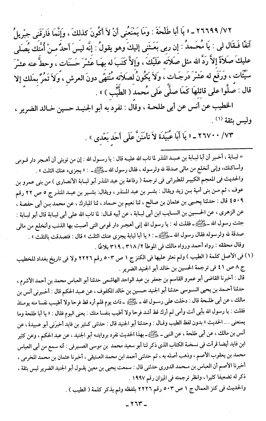 72/ 26699 - "يَا أَبا طَلحَةَ: وَمَا يَمْنَعُنِى أَنْ لاَ أَكُونَ كذلكَ، وَإنَّمَا فَارَقَنِي جبْريلُ آنفًا فَقَال لى: يَا مُحَمدُ: إِنَّ ربِى بَعَثَنِي إليكَ وهو يقولُ: إِنَّه ليسَ أَحدٌ مِنْ أُمَّتك يُصَلى عليكَ صَلاَةً إِلَّا رَدَّ الله مثل صَلاَتهِ عَلَيْكَ، وَإلَّا كَتَبَ له بِهَا عَشْرَ حَسَنَاتٍ، وحطَّ عنه عشْرَ سيِّئَات، وَرَفع له عَشْرَ دَرجَات، وَلاَ يَكُونُ لِصَلاَته مُنْتهًى دونَ العرشِ، وَلاَ تَمُرٌ بِمَلكٍ إلا قال: صَلَّوا على قائِلِهَا كَمَا صلَّى عَلى مُحمدٍ (الطَّيِّبِ) ".