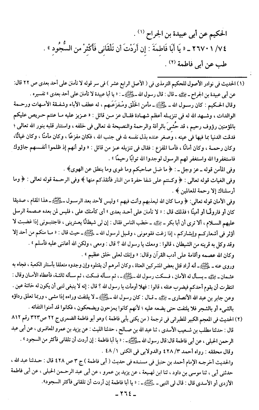74/ 26701 - "يَا أَبَا فَاطِمَةَ: إِنَّ أَرَدْتَ أن تَلقَانِي فَأَكْثِرْ من السُّجُودِ".