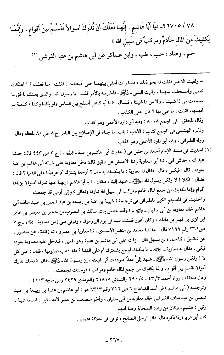 78/ 26705 - "يَا أَبَا هَاشِمٍ: إِنَّها لَعَلَّكَ أنْ تُدْرِكَ أموالًا تُقَسَّمُ بينَ أَقْوامٍ، وَإنَّمَا يَكفِيكَ مِنَ المَالِ خَادمٌ ومركبٌ في سَبيلِ الله".