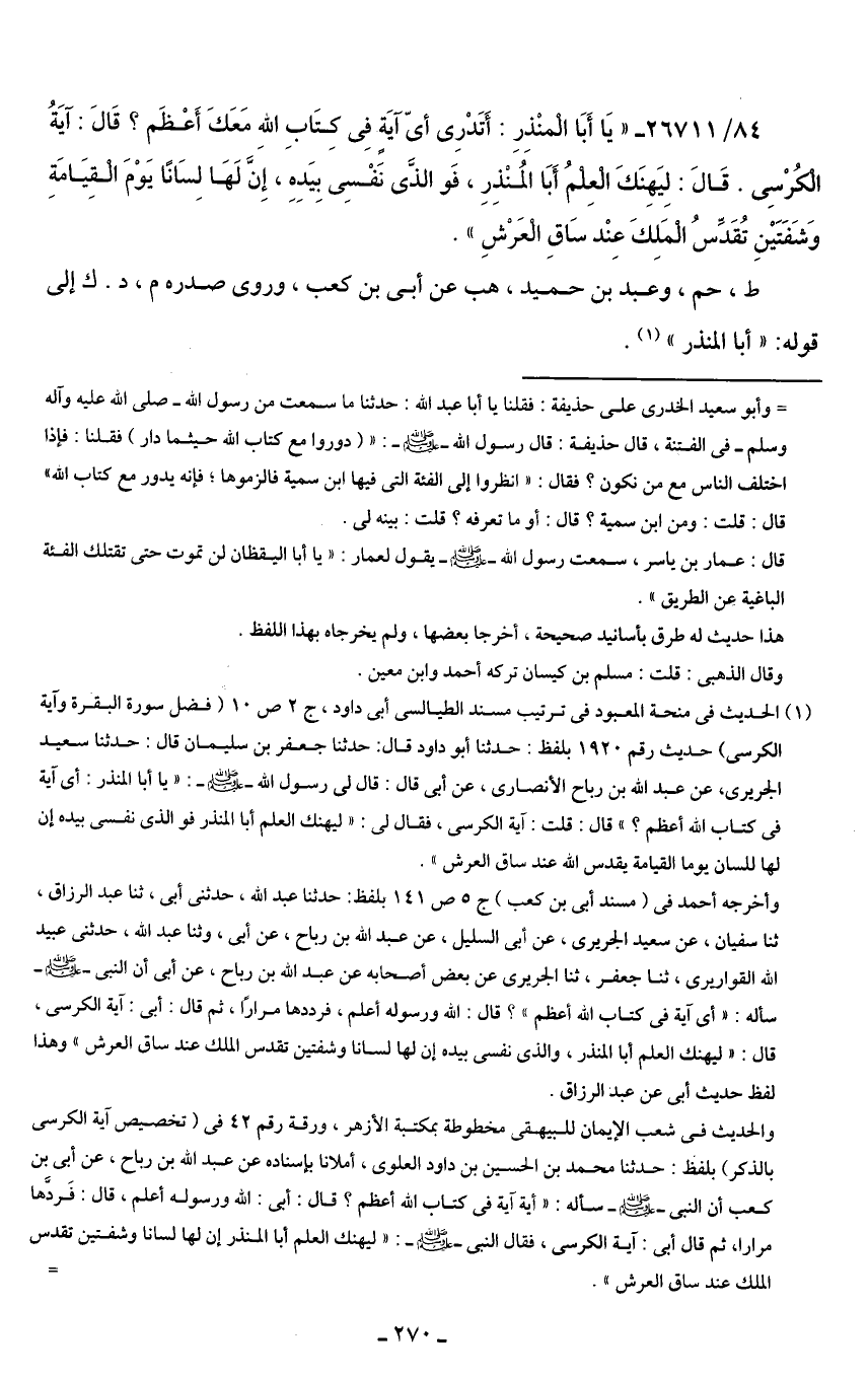 84/ 26711 - "يَا أَبَا الْمنْذِرِ: أَتَدْرِى أىّ آيَةٍ في كتَابِ اللهِ مَعَكَ أَعْظَم؟ قَالَ: آيَةُ الْكُرْسِى. قَالَ: ليَهِنَكَ الْعِلمُ أَبَا المُنْذِرِ، فَوالذَّى نَفْسِى بِيَدِهِ، إِنَّ لَهَا لِسَانًا يَوْمَ الْقِيَامَةِ وَشَفَتَيْنِ تُقَدِّسُ الْمَلِكَ عِنْد سَاقِ الْعَرْشِ".