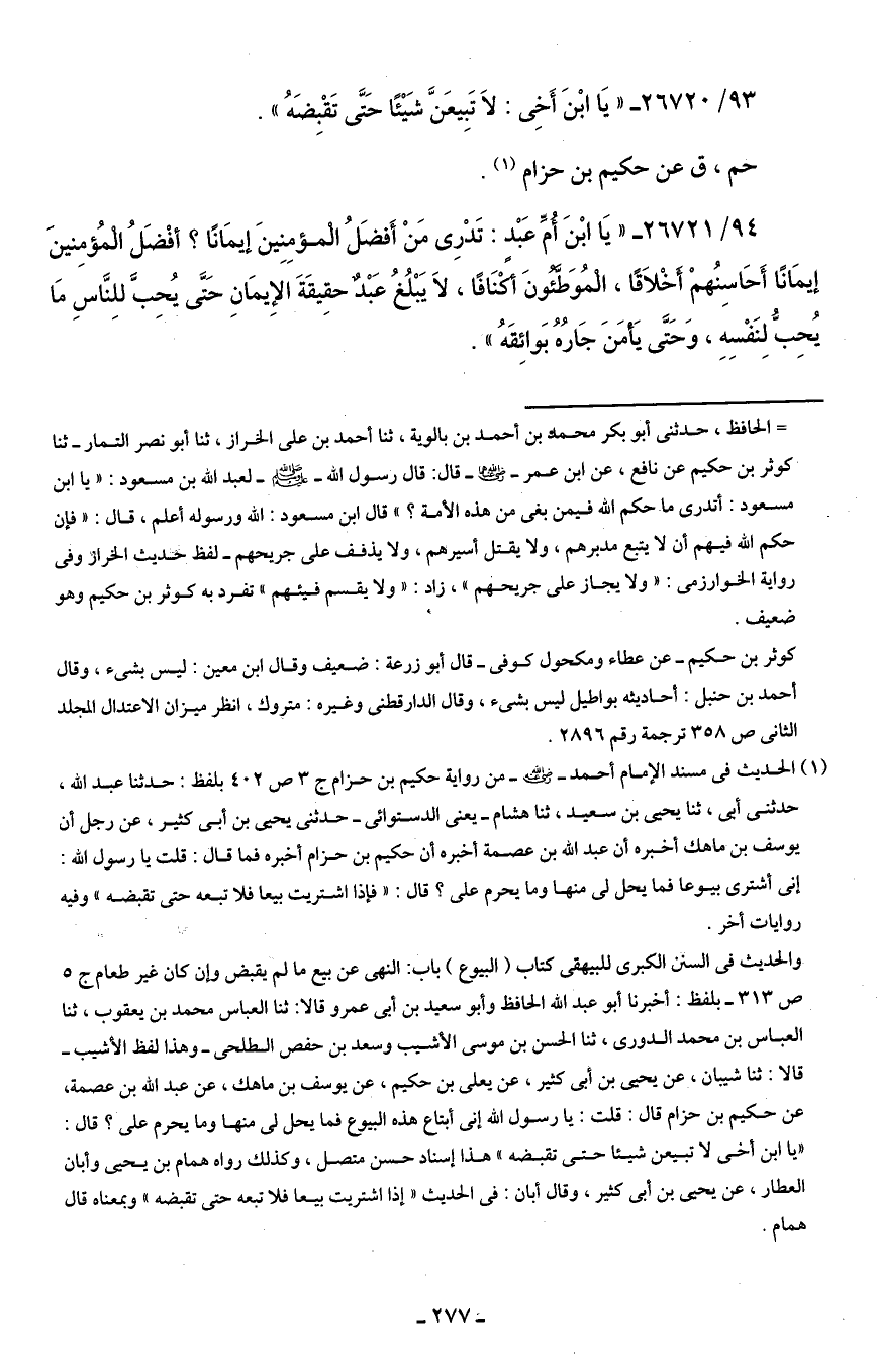 93/ 26720 - "يَا ابْنَ أَخِى: لاَ تَبِيعَنَّ شَيْئًّا حَتَّى تَقْبِضَهُ".
