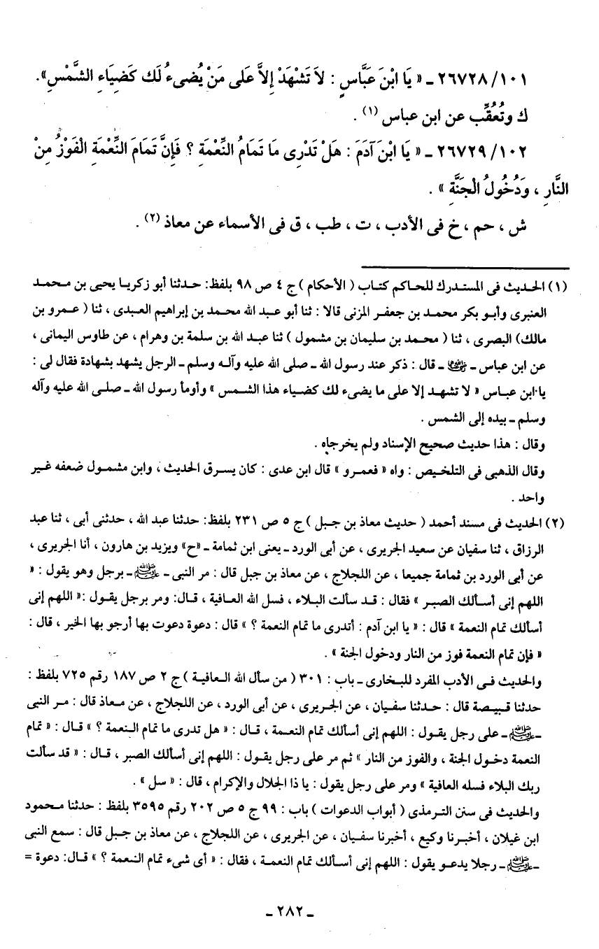 (¬2) الحديث في مسند أحمد (حديث معاذ بن جبل) ج 5 ص 231 بلفظ: حدثنا عبد الله، حدثنى أبى، ثنا عبد الرزاق، ثنا سفيان عن سعيد الجريرى، عن أبى الورد -يعنى ابن ثمامة- "ح" ويزيد بن هارون، أنا الجريرى، عن أبى الورد بن ثمامة جميعا، عن اللجلاج، عن معاذ بن جبل قال: مر النبي - صلى الله عليه وسلم - برجل وهو يقول: "اللهم إنى أسألك الصبر" فقال: قد سألت البلاء، غسل الله العافية، قال: ومر برجل يقول: "اللهم إنى أسألك تمام النعمة" قال: "يا ابن آدم: أتدرى ما تمام النعمة؟ " قال: دعوة دعوت بها أرجو بها الخير، قال: "فإن تمام النعمة فوز من النار ودخول الجنة".