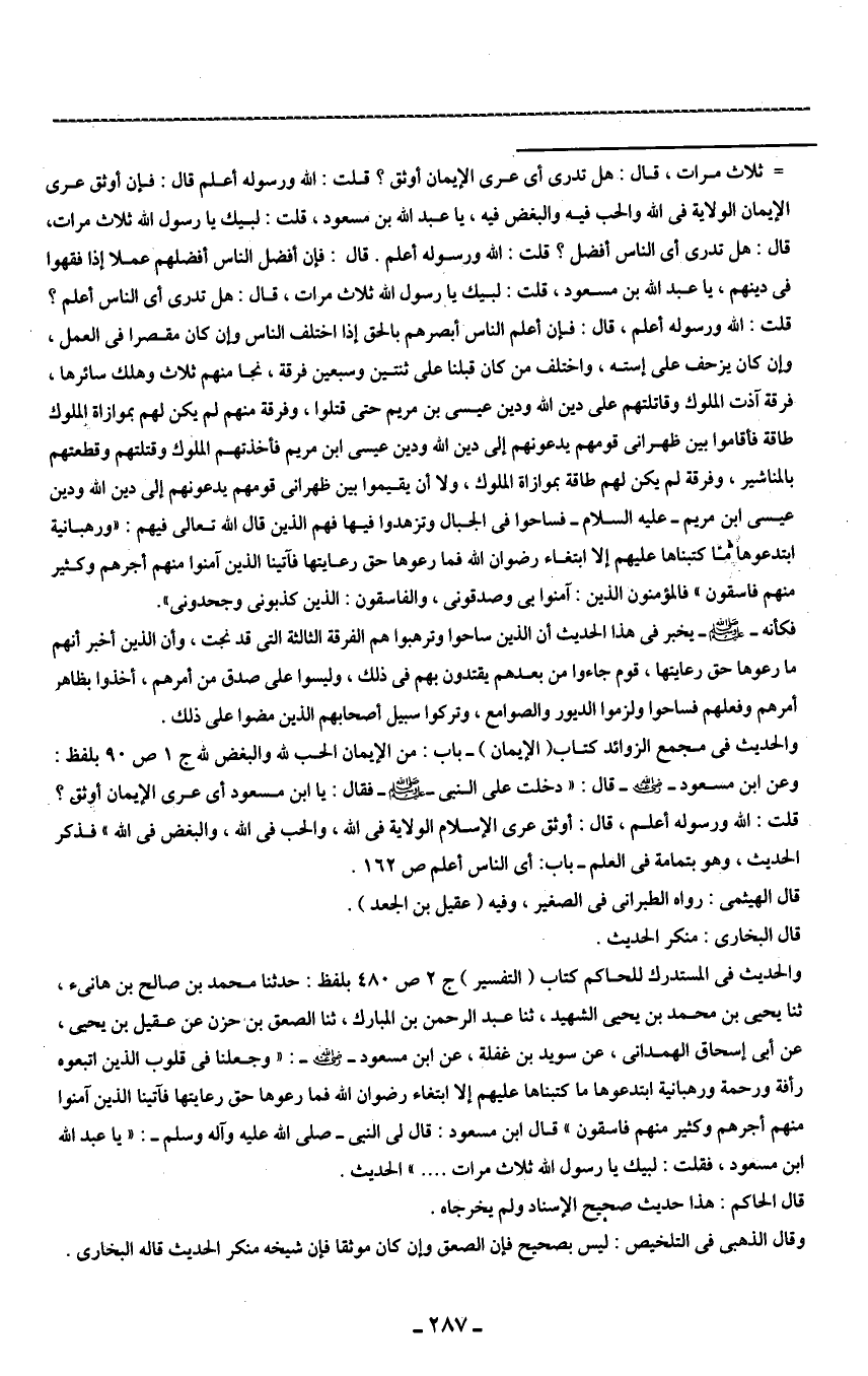 = ثلاث مرات، قال: هل تدرى أى عرى الإيمان أوثق؟ قلت: الله ورسوله أعلم قال: فإن أوثق عرى الإيمان الولاية في الله والحب فيه والبغض فيه، يا عبد الله بن مسعود، قلت: لبيك يا رسول الله ثلاث مرات، قال: هل تدرى أى الناس أفضل؟ قلت: الله ورسوله أعلم. قال: فإن أفضل الناس أفضلهم عملا إذا فقهوا في دينهم، يا عبد الله بن مسعود، قلت: لبيك يا رسول الله ثلاث مرات، قال: هل تدرى أى الناس أعلم؟ قلت: الله ورسوله أعلم، قال: فإن أعلم الناس أبصرهم بالحق إذا اختلف الناس وإن كان مقصرا في العمل، وإن كان يزحف على إسته، واختلف من كان قبلنا على ثنتين وسبعين فرقة، نجا منهم ثلاث وهلك سائرها، فرقة آذت الملوك وقاتلتهم على دين الله ودين عيسى بن مريم حتى قتلوا، وفرقة منهم لم يكن لهم بموازاة الملوك طاقة فأقاموا بين ظهرانى قومهم يدعونهم إلى دين الله ودين عيسى ابن مريم فأخذتهم الملوك وقتلتهم وقطعتهم بالمناشير، وفرقة لم يكن لهم طاقة بموازاة الملوك، ولا أن يقيموا بين ظهرانى قومهم يدعونهم إلى دين الله ودين عيسى ابن مريم -عليه السلام- فساحوا في الجبال وتزهدوا فيها فهم الذين قال الله تعالى فيهم: {وَرَهْبَانِيَّةً ابْتَدَعُوهَا مَا كَتَبْنَاهَا عَلَيْهِمْ إِلَّا ابْتِغَاءَ رِضْوَانِ اللَّهِ فَمَا رَعَوْهَا حَقَّ رِعَايَتِهَا فَآتَيْنَا الَّذِينَ آمَنُوا مِنْهُمْ أَجْرَهُمْ وَكَثِيرٌ مِنْهُمْ فَاسِقُونَ} فالمؤمنون الذين: آمنوا بى وصدقونى، والفاسقون: الذين كذبونى وجحدونى".