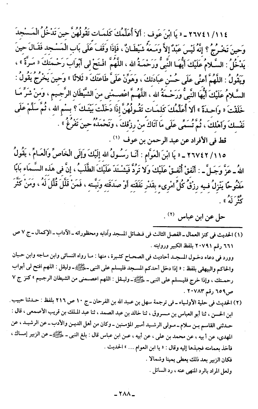 114/ 26741 - "يا ابن عوف: ألا أعلمك كلمات تقولهن حين تدخل المسجد وحين تخرج؟ إنه ليس عبد إلا ومعه شيطان، فإذا وقف على باب المسجد فقال حين يدخل: السلام عليك أيها النبي ورحمة الله، اللهم افتح لى أبواب رحمتك "مرة"، ويقول: اللهم أعنى على حسن عبادتك، وهون على طاعتك "ثلاثًا" وحين يخرج يقول: السلام عليك أيها النبي ورحمة الله، اللهم اعصمنى من الشيطان الرجيم، ومن شر ما خلقت "واحدة" ألا أعلمك كلمات تقولهن إذا دخلت بيتك؟ بسم الله، ثم سلم على نفسك وأهلك، ثم تسمى على ما آتاك من رزقك، وتحمده حين تفرغ".