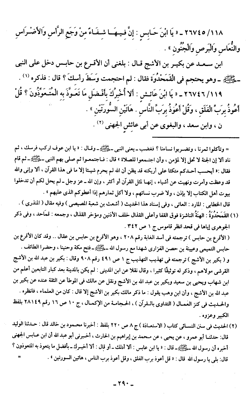 (¬2) الحديث في سنن النسائى كتاب (الاستعاذة) ج 8 ص 220 بلفظ: أخبرنا محمود بن خالد قال: حدثنا الوليد قال: حدثنا أبو عمرو، عن يحيى، عن محمد بن إبراهيم بن الحارث، أخبرنى أبو عبد الله أن ابن عابس الجهنى أخبره أن رسول الله - صلى الله عليه وسلم - قال: "يا ابن عابس: ألا أدلك -أو قال: ألا أخبرك- بأفضل ما يتعوذ به المتعوذون؟ قال: بلى يا رسول الله قال: "قل أعوذ برب الفلق، وقل أعوذ برب الناس، هاتين السورتين". =