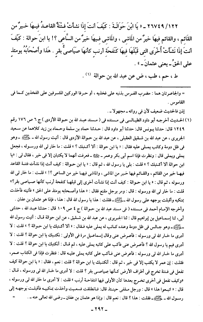 122/ 26749 - "يَا ابْنَ حَوَالَةَ: كَيْفَ أنتَ إِذَا نشأتْ فِتْنَةٌ القاعدُ فِيهَا خيرٌ من القَائِم، والقائم فِيهَا خيرٌ من المَاشِى، والمَاشِى فِيهَا خيرٌ من السَّاعِى؟ ! يا ابنَ حوالة: كَيْفَ أنتَ إذَا نَشَأتْ أُخْرَى التِى قَبْلَهَا فِيهَا كنَفحَةِ أرنبٍ كأنهَا صَيَاصىُّ بقرٍ. هَذا وأَصحَابهُ يومئذٍ على الحقِّ -يعنى عثمانَ-".