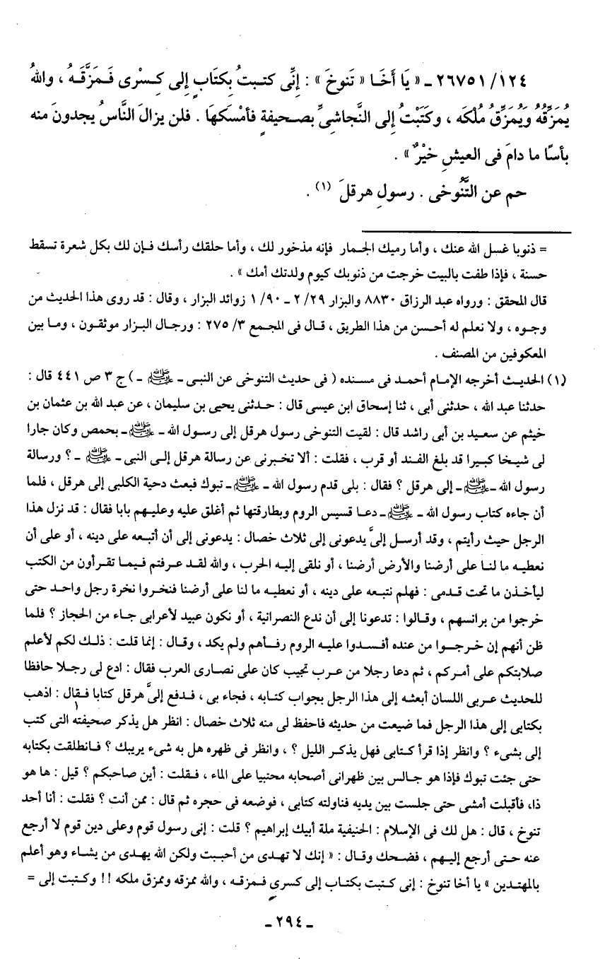 124/ 26751 - "يَا أَخَا "تَنوخَ": إِنِّى كتبتُ بِكتَابٍ إِلى كِسْرى فَمَزَّقَهُ، واللهُ يُمَزّقُهُ وَيُمَزِّقُ مُلكه، وكَتَبْتُ إِلى النَّجاشِىِّ بصحيفةٍ فأمْسَكهَا. فلن يزالَ النَّاسُ يجدونَ منه بأسًا ما دامَ في العيشِ خيْرٌ".