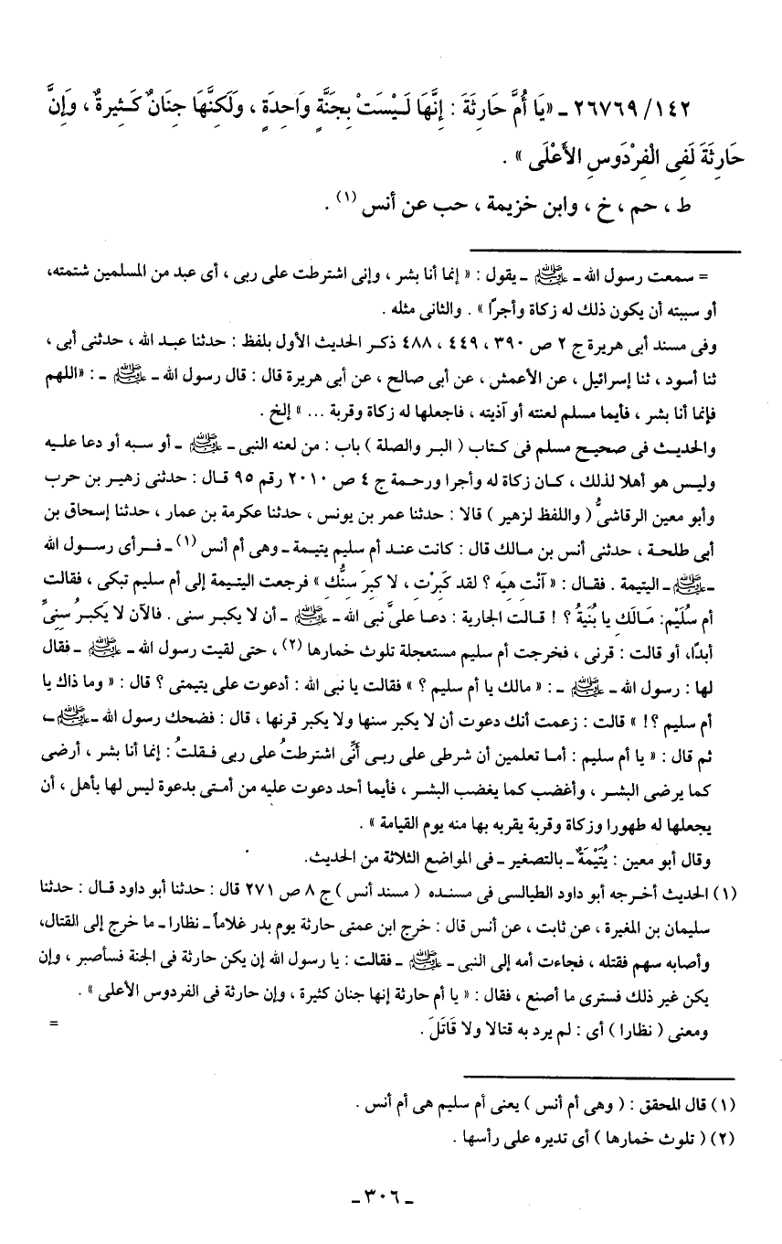 142/ 26769 - " يَا أُمَّ حَارِثَةَ: إِنَّهَا لَيْسَتْ بِجَنَّةٍ وَاحِدَةٍ، وَلَكِنَّهَا جِنَانٌ كَثِيرةٌ، وَإنَّ حَارِثَةَ لَفِى الفِرْدَوسِ الأعْلَى ".