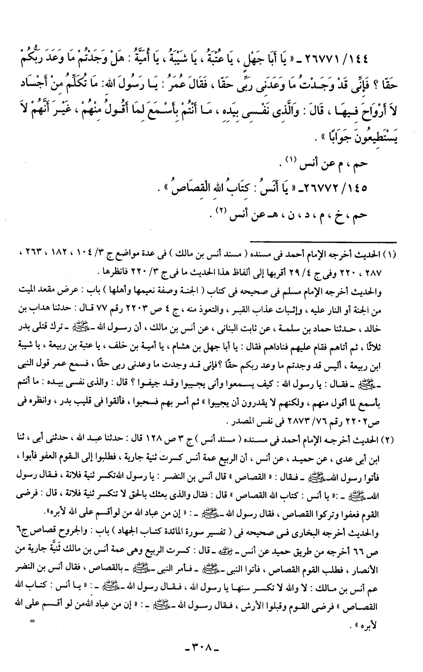 144/ 26771 - " يَا أَبَا جَهْلٍ، يَا عُتْبَةُ، يَا شَيْبَةُ، يَا أُمَيَّةُ: هَلْ وَجَدْتُمْ مَا وَعَدَ رَبُّكُمْ حَقّا؟ فَإِنِّى قَدْ وَجَدْتُ مَا وَعَدَنِى ربِّى حَقّا، فَقَالَ عُمَرُ: يَا رَسُولَ اللهِ: مَا تُكَلِّمُ مِنْ أَجْسَاد لاَ أرْوَاحَ فِيهَا، قَالَ: وَالَّذِى نَفْسِى بِيَدِهِ، مَا أَنْتُمْ بِأسْمَعَ لِمَا أَقُولُ مِنْهُمْ، غَيْرَ أَنَّهُمْ لاَ يَسْتَطِيعُونَ جَوَابًا ".