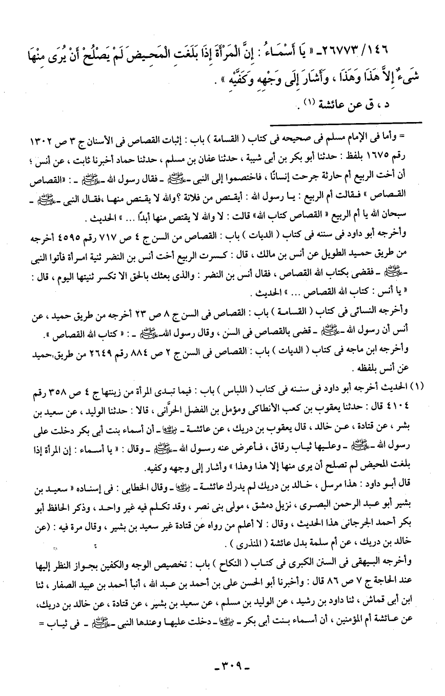 146/ 26773 - " يَا أَسْمَاءُ: إِنَّ المَرْأَةَ إِذَا بَلَغَتِ المَحِيضَ لَمْ يَصْلُحْ أنْ يُرَى مِنْهَا شَئٌ إِلاَّ هَذَا وَهَذَا، وَأشَارَ إِلَى وَجْهِهِ وَكَفَّيْهِ ".