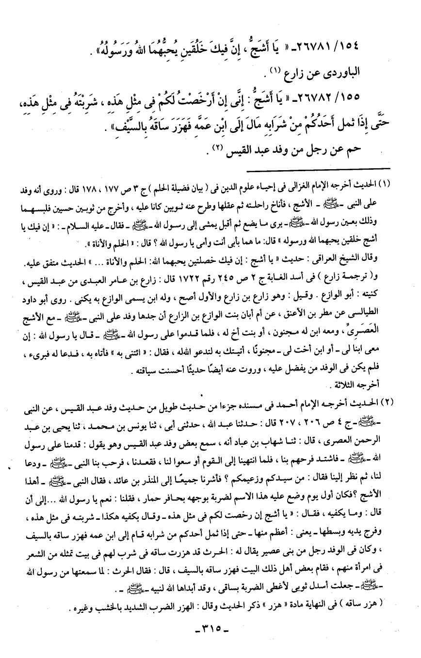 (¬2) الحديث أخرجه الإمام أحمد في مسنده جزءا من حديث طويل من حديث وفد عبد القيس، عن النبي - صلى الله عليه وسلم - ج 4 ص 206، 207 قال: حدثنا عبد الله، حدثنى أبى، ثنا يونس بن محمد، ثنا يحيى بن عبد الرحمن العصرى، قال: ثنا شهاب بن عباد أنه، سمع بعض وفد عبد القيس وهو يقول: قدمنا على رسول الله - صلى الله عليه وسلم - فاشتد فرحهم بنا، فلما انتهينا إلى القوم أوسعوا لنا، فقعدنا، فرحب بنا النبي - صلى الله عليه وسلم - ودعا لنا، ثم نظر إلينا فقال: من سيدكم وزعيمكم؟ فأشرنا جميعًا إلى المنذر بن عائد، فقال النبي - صلى الله عليه وسلم - أهذا الأشج؟ فكان أول يوم وضع عليه هذا الاسم لضربة بوجهه بحافر حمار، فقلنا: نعم يا رسول الله ... إلى أن قال: وما يكفيه، فقال: " يا أشج إن رخصت لكم في مثل هذه -وقال بكفيه هكذا- شربته في مثل هذه، وفرج يديه وبسطها -يعنى: أعظم منها- حتى إذا ثمل أحدكم من شرابه قام إلى ابن عمه فهزر ساقه بالسيف، وكان في الوفد رجل من بنى عصير يقال له: الحرث قد هزرت ساقه في شرب لهم في بيت تمثله من الشعر في امرأة منهم، فقام بعض أهل ذلك البيت فهزر ساقه بالسيف، قال: فقال الحرث. لما سمعتها من رسول الله - صلى الله عليه وسلم - جعلت أسدل ثوبى لأغطى الضربة بساقى، وقد أبداها الله لنبيه - صلى الله عليه وسلم -.