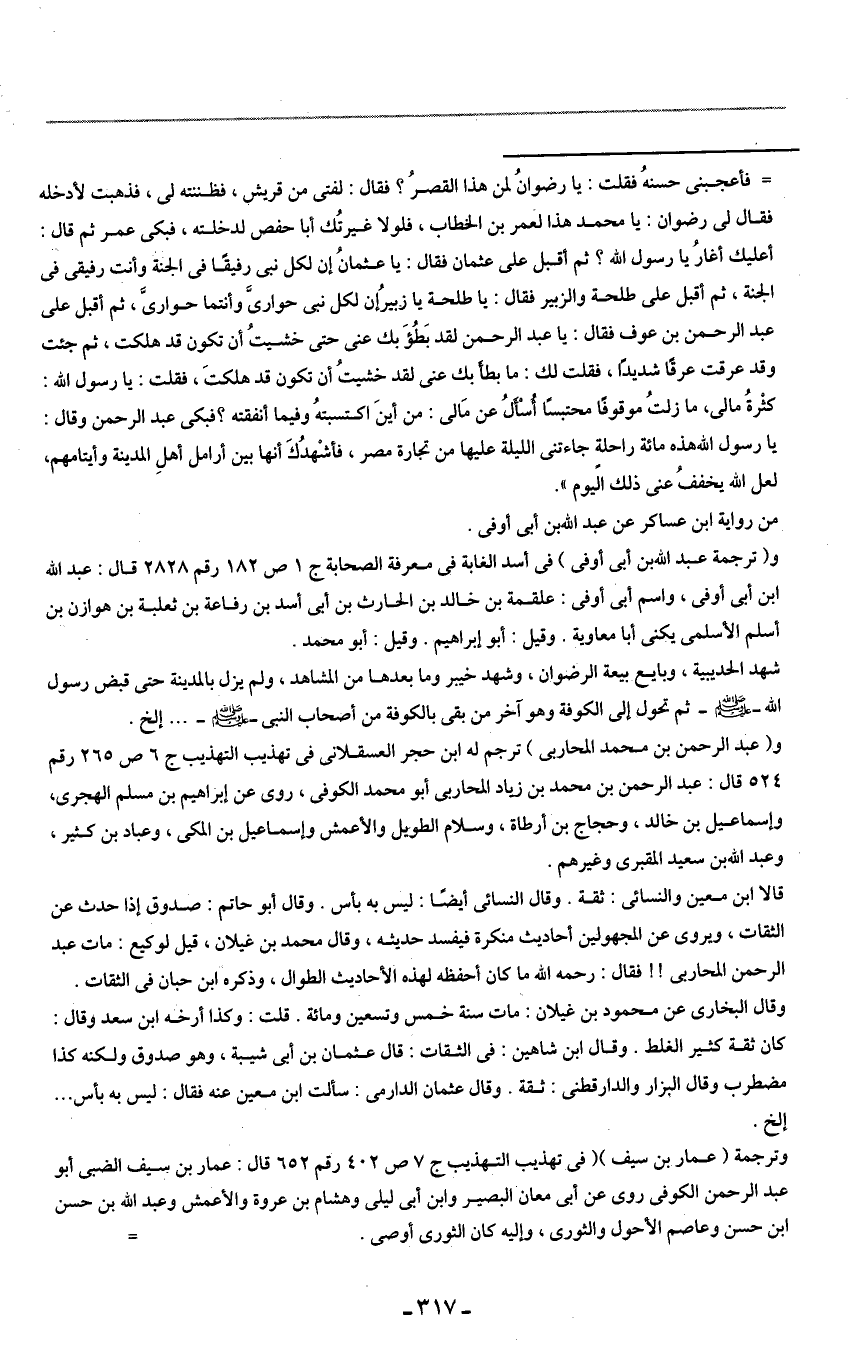 = فأعجبنى حسنهُ فقلت: يا رضوانُ لمن هذا القصرُ؟ فقال: لفتى من قريش، فظننته لى، فذهبت لأدخله فقال لى رضوان: يا محمد هذا لعمر بن الخطاب، فلولا غيرتُك أبا حفص لدخلته، فبكى عمر ثم قال: أعليك أغارُ يا رسول الله؟ ثم أقبل على عثمان فقال: يا عثمانُ إن لكل نبى رفيقًا في الجنة وأنت رفيقى في الجنة، ثم أقبل على طلحة والزبير فقال: يا طلحة يا زبيرُ إن لكل نبى حوارى وأنتما حوارىَّ، ثم أقبل على عبد الرحمن بن عوف فقال: يا عبد الرحمن لقد بَطُؤَ بك عنى حتى خشيتُ أن تكون قد هلكت، ثم جئت وقد عرقت عرقًا شديدًا، فقلت لك: ما بطأَ بك عنى لقد خشيتُ أن نكون قد هلكتَ، فقلت: يا رسول الله: كثْرةُ مالى، ما زلتُ موقوفًا محتبسًا أُسْأَلُ عن مَالى: من أينَ اكتسبتهُ وفيما أنفقته؟ فبكى عبد الرحمن وقال: يا رسول الله هذه مائة راحلةٍ جاءتنى الليلة عليها من تجارة مصر، فأشْهدُكَ أنها بين أرامل أهل المدينة وأيتامهم، لعل الله يخففُ عنى ذلك اليوم".