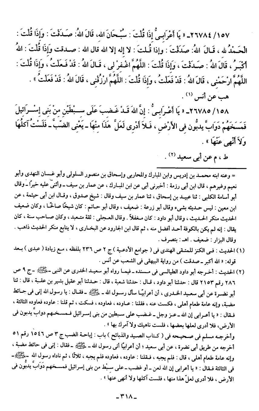 158/ 26785 - " يَا أَعْرَابِىُّ: إِنَّ اللهَ قَدْ غَضِبَ عَلَى سِبْطَيْنِ مِنْ بَنِى إِسْرَائِيلَ فَمَسَخَهُمْ دَوَابَّ يدبُّون فِى الأَرْضِ، فَلاَ أَدْرِى لَعَلَّ هَذَا مِنْهَا -يَعْنِى الضّبَّ- فَلَسْتُ آكلُهَا وَلاَ أَنْهى عَنْهَا".
