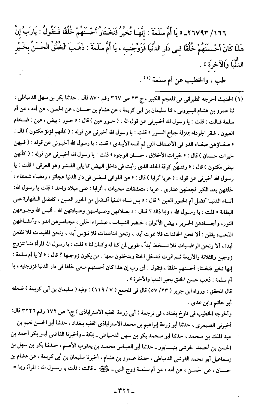 (¬1) الحديث أخرجه الطبرانى في المعجم الكبير، ج 23 ص 367 رقم 870 قال: حدثنا بكر بن سهل الدمياطى، ثنا عمرو بن هشام البيرونى، ثنا سليمان بن أبى كريمة، عن هشام بن حسان، عن الحسن، عن أمه، عن أم سلمة قالت: قلت: يا رسول الله أخبرنى عن قول الله: (حور عين) قال: "حور: بيض، عين: ضخام العيون، شقر الجرداء بمنزلة جناح النسور" قلت: يا رسول الله أخبرنى عن قوله: (كأنهم لؤلؤ مكنون) قال: "صفاؤهن صفاء الدر في الأصداف التى لم تمسه الأيدى" قلت: يا رسول الله أخبرنى عن قوله: (فيهن خيرات حسان) قال: "خيرات الأخلاق، حسان الوجوه" قلت: يا رسول الله أخبرنى عن قوله: (كأنهن بيض مكنون) قال: "رقتهُن كرقة الجلد الذى رأيت في داخل البيض مما يلى القشر وهو العرقى" قلت: يا رسول الله أخبرنى عن قوله: (عربا أترابا) قال: " من اللواتى قبضن في دار الدنيا عجائز، رمضاء شمطاء، خلقهن بعد الكبر فجعلهن عذارى. عربا: متعشقات محببات، أترابا: على ميلاد واحد" قلت يا رسول الله: أنساء الدنيا أفضل أم الحور العين؟ قال: " بل نساء الدنيا أفضل من الحور العين، كفضل الظهارة على البطانة" قلت: يا رسول الله، وبما ذاك؟ قال: "بصلاتهن وصيامهن وعبادتهن الله. ألبس الله وجوههن النور، وأجسادهن الحرير، بيض الألوان، خضر الثياب، صفراء الحلى، مجامرهن الدر، وأمشاطهن الذهب، يقلن: ألا نحن الخالدات فلا نموت أبدا، ونحن الناعمات فلا نبؤس أبدا، ونحن المقيمات فلا نظعن أبدا، ألا ونحن الراضيات فلا نسخط أبدًا، طوبى لمن كنا له وكان لنا" قلت: يا رسول الله المرأة منا تتزوج زوجين والثلاثة والأربعة ثم تموت فتدخل الجنة ويدخلون معها. من يكون زوجها؟ قال: " لا يا أم سلمة: إنها تخير فتختار أحسنهم خلقا، فتقول: أبى رب إن هذا كان أحسنهم معى خلقا في دار الدنيا فزوجنيه، يا أم سلمة: ذهب حسن الخلق بخير الدنيا والآخرة".