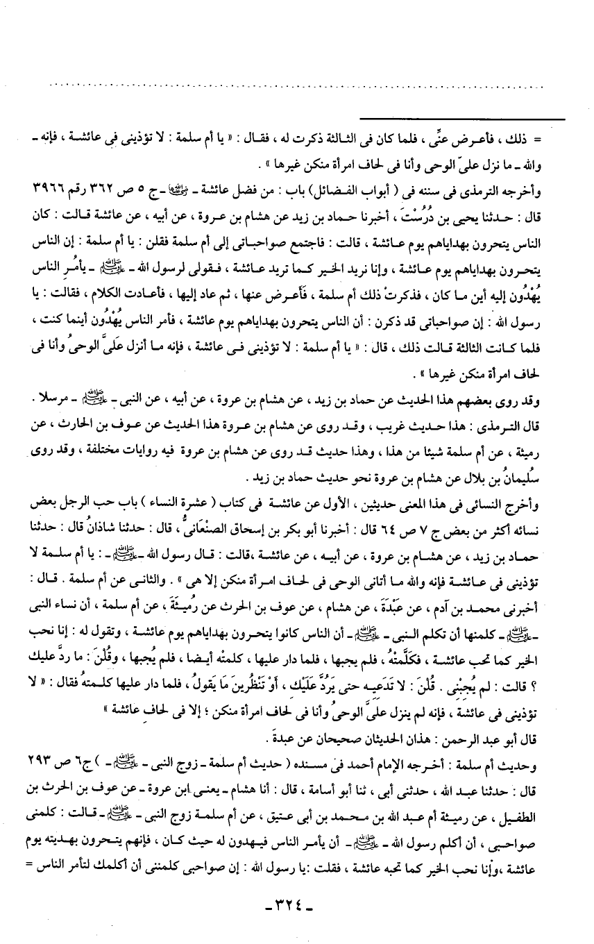 وأخرجه الترمذى في سننه في (أبواب الفضائل) باب: من فضل عائشة -رضي الله عنها - ج 5 ص 362 رقم 3966 قال: حدثنا يحيى بن دُرُسْتَ، أخبرنا حماد بن زيد عن هشام بن عروة، عن أبيه، عن عائشة قالت: كان الناس يتحرون بهداياهم يوم عائشة، قالت: فاجتمع صواحباتى إلى أم سلمة فقلن: يا أم سلمة: إن الناس يتحرون بهداياهم يوم عائشة، وإنا نريد الخير كما تريد عائشة، فقولى لرسول الله - صلى الله عليه وسلم - يأمُرِ الناس يُهْدُون إليه أين ما كان، فذكرتْ ذلك أم سلمة، فَأَعرض عنها، ثم عاد إليها، فأعادت الكلام، فقالت: يا رسول الله: إن صواحباتى قد ذكرت أن الناس يتحرون بهداياهم يوم عائشة، فأمر الناس يُهْدُون أينما كنت، فلما كانت الثالثة قالت ذلك، قال: " يا أم سلمة: لا تؤذينى في عائشة، فإنه ما أنزل عَلىَّ الوحىُ وأنا في لحاف امرأة منكن غيرها ".