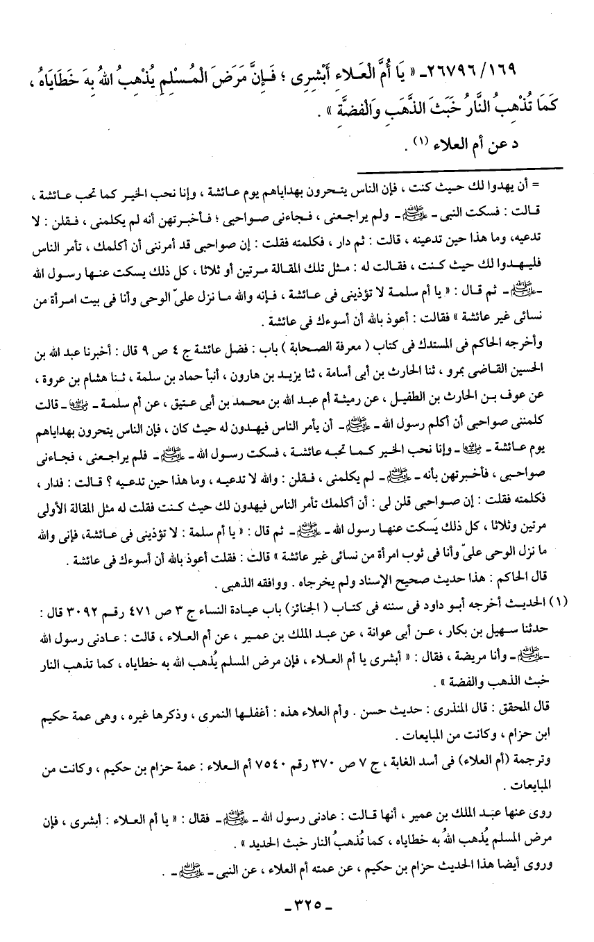 169/ 26796 - " يَا أُمَّ الْعَلاء أَبْشِرِى؛ فَإِنَّ مَرَضَ الْمُسْلِم يُذْهِبُ اللهُ بهَ خَطَايَاهُ، كَمَا تُذْهِبُ النَّارُ خَبَثَ الذَّهَبِ وَالْفضَّةَ ".
