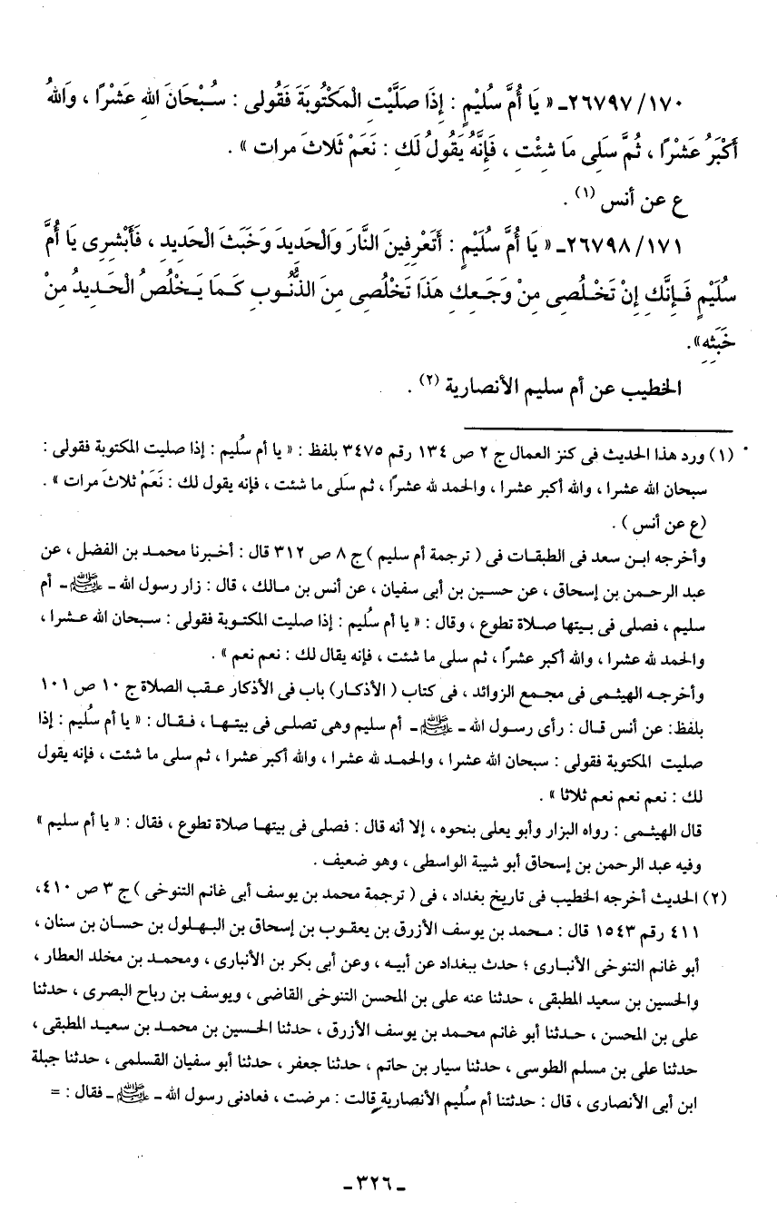 (¬1) ورد هذا الحديث في كنز العمال ج 2 ص 134 رقم 3475 بلفظ: " يا أم سُليم: إذا صليت المكتوبة فقولى: سبحان الله عشرا، والله أكبر عشرا، والحمد لله عشرًا، ثم سَلى ما شئت، فإنه يقول لك: نَعَمْ ثلاثَ مرات ". (ع عن أنس).