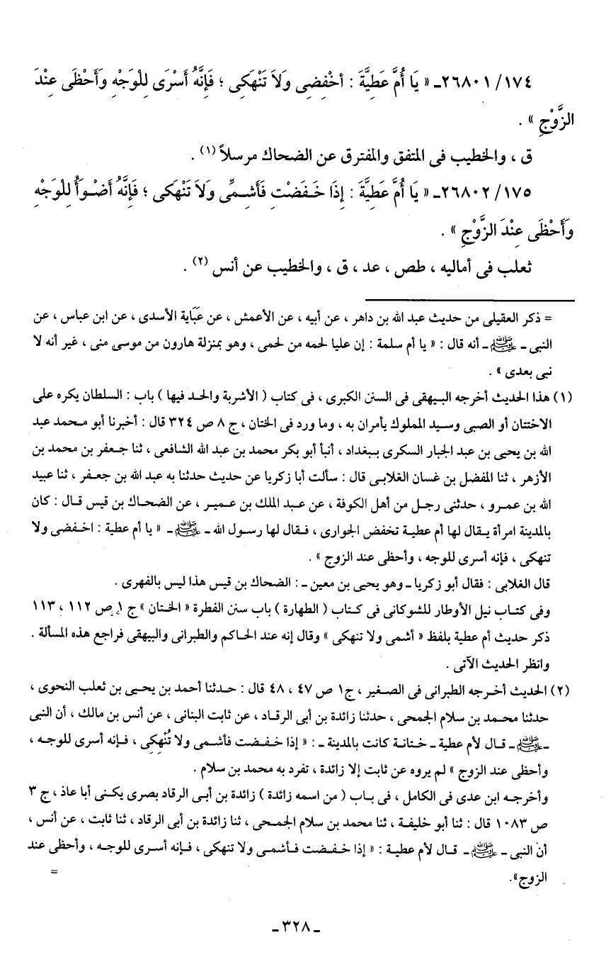 174/ 26801 - " يَا أُمَّ عَطِيَّةَ: أخْفِضِى وَلاَ تَنْهَكِى، فَإِنَّهُ أَسْرَى لِلْوَجْهِ وَأَحْظَى عِنْدَ الزَّوْجِ ".
