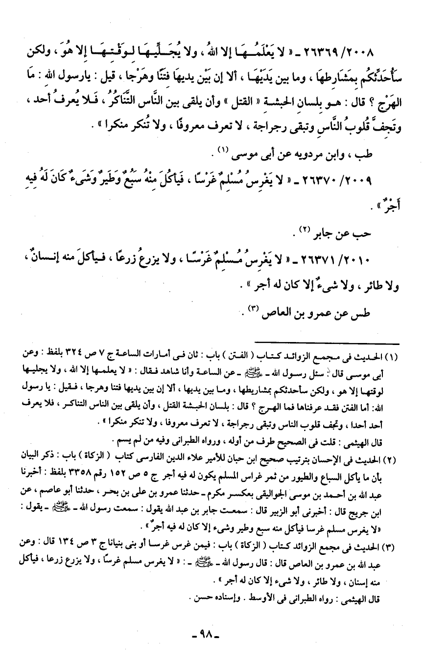 2008/ 26369 - "لا يَعْلَمُهَا إلا اللهُ، ولا يُجَلِّيهَا لِوَقْتِهَا إِلا هُوَ، ولكن سَأحَدِّثكُم بِمَشَارِطهَا، وما بين يَدَيهَا، ألا إن بَيْن يديهَا فِتنًا وهَرْجا، قيل: يا رسول اللهِ: مَا الهَرْج؟ قال: هو بِلسانِ الحبشةِ "القتل" وأن يلقى بين النَّاس التَّنَاكُرُ، فَلا يُعرفُ أحد، وتَجِفَّ قُلوبُ النَّاسِ وتبقى رجراجة، لا تعرف معروفًا، ولا تُنكر منكرا".