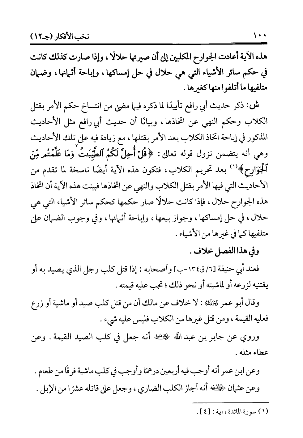 ش: ذكر حديث أبي رافع تأييدًا لما ذكره فيما مضى من انتساخ حكم الأمر بقتل الكلاب وحكم النهي عن اتخاذها، وبيانًا أن حديث أبي رافع مثل الأحاديث المذكور في إباحة اتخاذ الكلاب بعد الأمر بقتلها، مع زيادة فيه على تلك الأحاديث وهي أنه يتضمن نزول قوله تعالى: {قُلْ أُحِلَّ لَكُمُ الطَّيِّبَاتُ وَمَا عَلَّمْتُمْ مِنَ الْجَوَارِحِ} (¬1) بعد تحريم الكلاب، فتكون هذه الآية أيضًا ناسخة لما تقدم من الأحاديث التي فيها الأمر بقتل الكلاب والنهي عن اتخاذها فبينت هذه الآية أن اتخاذ هذه الجوارح حلال، فإذا كانت حلالاً صار حكمها كحكم سائر الأشياء التي هي حلال، في حل إمساكها، وجواز بيعها، وإباحة أثمانها، وفي وجوب الضمان على متلفيها كما في غيرها من الأشياء.