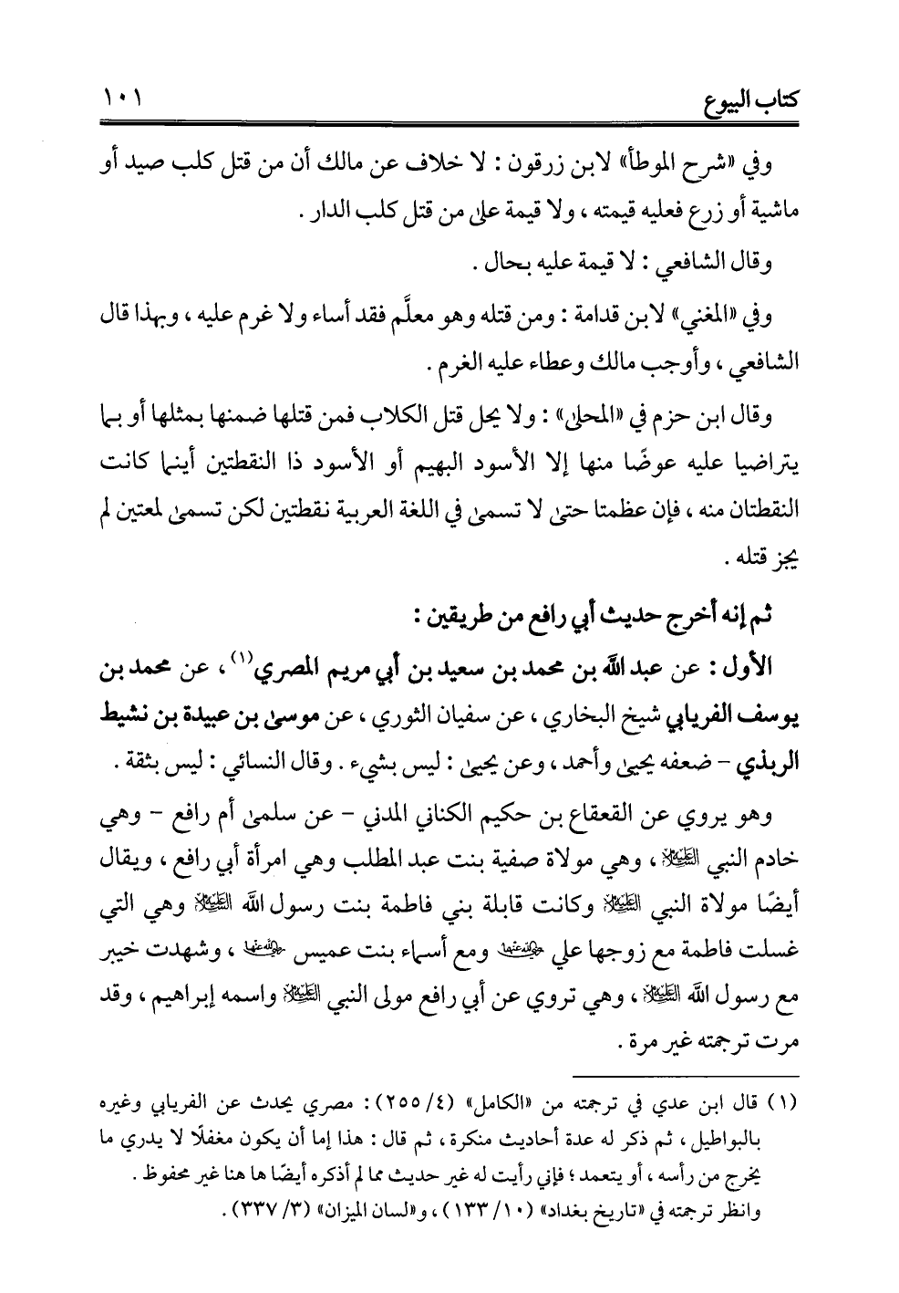 وهو يروي عن القعقاع بن حكيم الكناني المدني -عن سلمى أم رافع- وهي خادم النبي -عليه السلام-، وهي مولاة صفية بنت عبد المطلب وهي امرأة أبي رافع، ويقال أيضًا مولاة النبي -عليه السلام- وكانت قابلة بني فاطمة بنت رسول الله -عليه السلام- وهي التي غسلت فاطمة مع زوجها علي -رضي الله عنهما- ومع أسماء بنت عميس -رضي الله عنها-، وشهدت خيبر مع رسول الله -عليه السلام-، وهي تروي عن أبي رافع مولى النبي -عليه السلام- واسمه إبراهيم، وقد مرت ترجمته غير مرة.