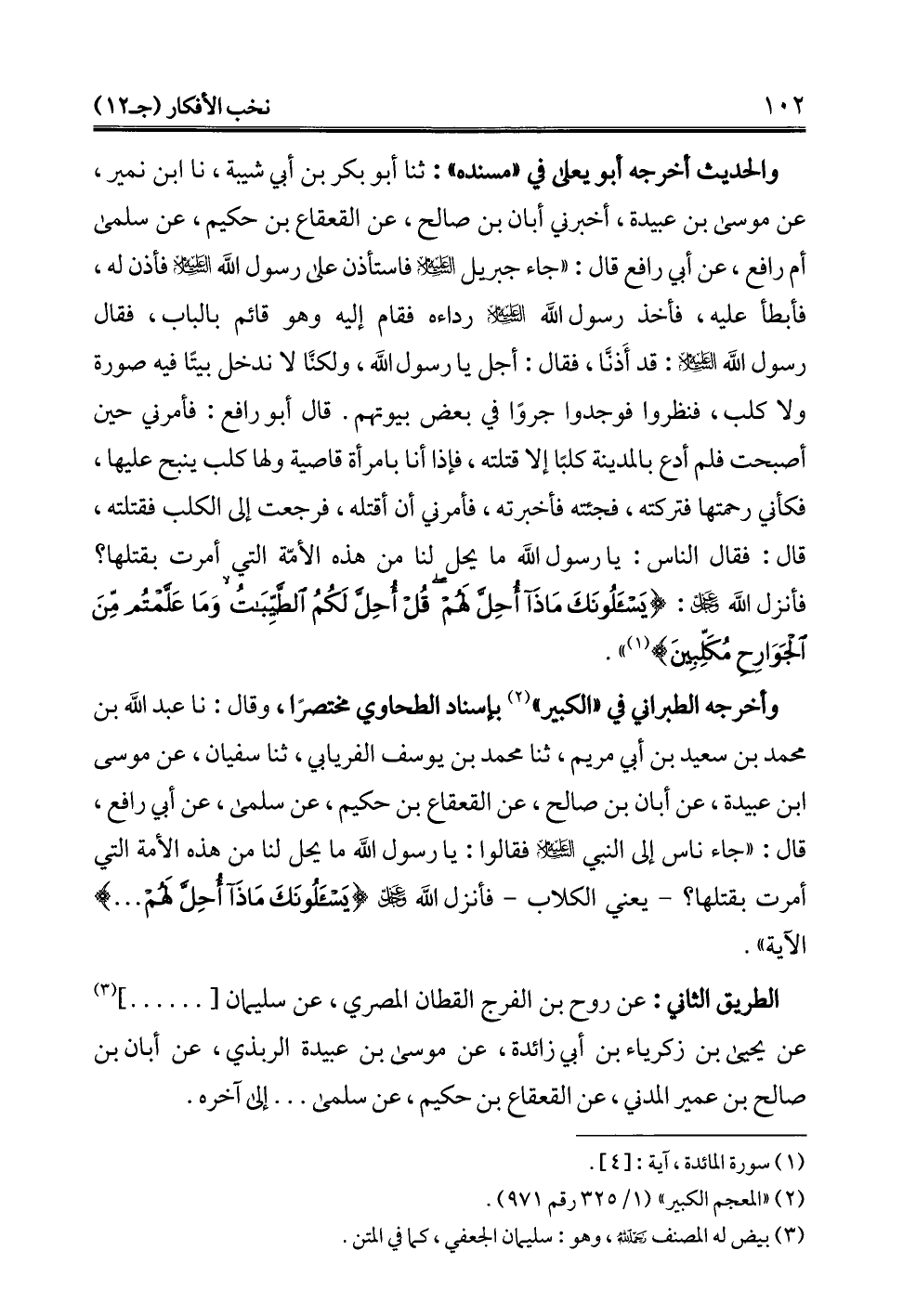 والحديث أخرجه أبو يعلى في "مسنده": ثنا أبو بكر بن أبي شيبة، نا ابن نمير، عن موسى بن عبيدة، أخبرني أبان بن صالح، عن القعقاع بن حكيم، عن سلمى أم رافع، عن أبي رافع قال: "جاء جبريل -عليه السلام- فاستأذن على رسول الله -عليه السلام- فأذن له، فأبطأ عليه، فأخذ رسول الله -عليه السلام- رداءه فقام إليه وهو قائم بالباب، فقال رسول الله -عليه السلام-: قد أَذنَّا، فقال: أجل يا رسول الله، ولكنَّا لا ندخل بيتًا فيه صورة ولا كلب، فنظروا فوجدوا جروًا في بعض بيوتهم. قال أبو رافع: فأمرني حين أصبحت فلم أدع بالمدينة كلبًا إلا قتلته، فإذا أنا بامرأة قاصية ولها كلب ينبح عليها، فكأني رحمتها فتركته، فجئته فأخبرته، فأمرني أن أقتله، فرجعت إلى الكلب فقتلته، قال: فقال الناس: يا رسول الله ما يحل لنا من هذه الأمّة التي أمرت بقتلها؟ فأنزل الله -عز وجل- {يَسْأَلُونَكَ مَاذَا أُحِلَّ لَهُمْ قُلْ أُحِلَّ لَكُمُ الطَّيِّبَاتُ وَمَا عَلَّمْتُمْ مِنَ الْجَوَارِحِ مُكَلِّبِينَ} (¬1) ".
