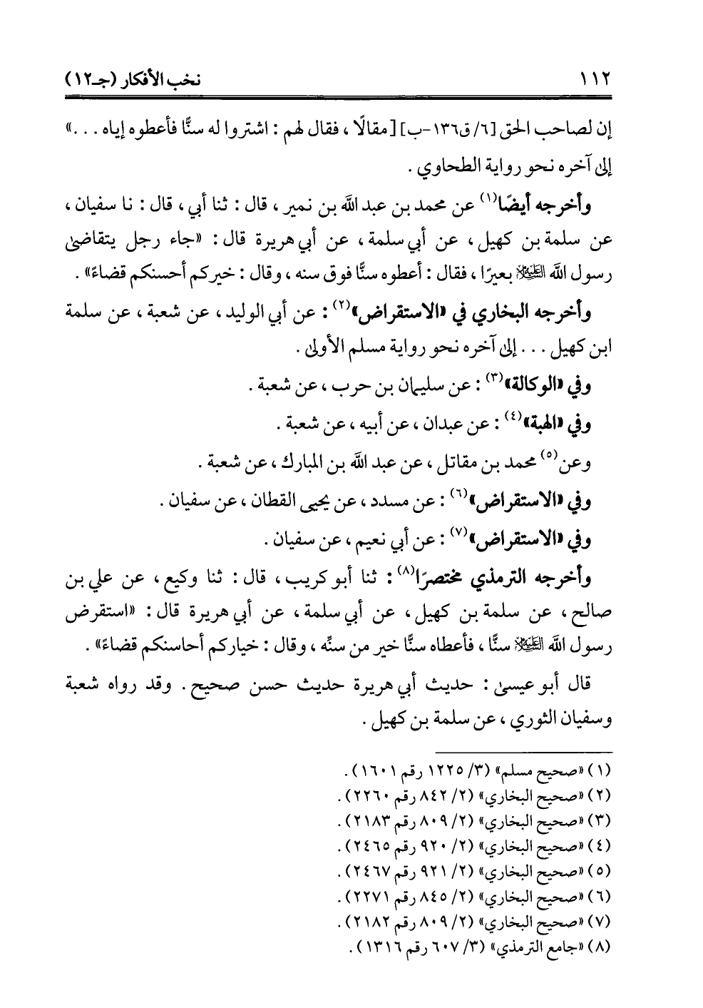 وأخرجه أيضًا (¬1) عن محمد بن عبد الله بن نمير، قال: ثنا أبي، قال: نا سفيان، عن سلمة بن كهيل، عن أبي سلمة، عن أبي هريرة قال: "جاء رجل يتقاضى رسول الله -عليه السلام- بعيرًا، فقال: أعطوه سنًّا فوق سنه، وقال: خيركم أحسنكم قضاءً".
