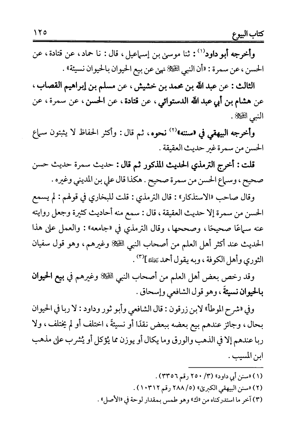 وأخرجه أبو داود (¬1): ثنا موسى بن إسماعيل، قال: نا حماد، عن قتادة، عن الحسن، عن سمرة: "أن النبي -عليه السلام- نهى عن بيع الحيوان بالحيوان نسيئة".