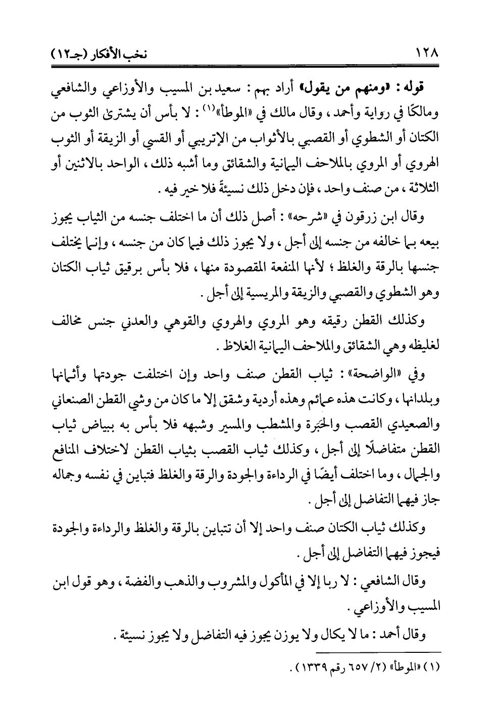 وقال ابن زرقون في "شرحه": أصل ذلك أن ما اختلف جنسه من الثياب يجوز بيعه بما خالفه من جنسه إلى أجل، ولا يجوز ذلك فيما كان من جنسه، وإنما يختلف جنسها بالرقة والغلظ؛ لأنها المنفعة المقصودة منها، فلا بأس برقيق ثياب الكتان وهو الشطوي والقصبي والزيقة والمريسية إلى أجل.