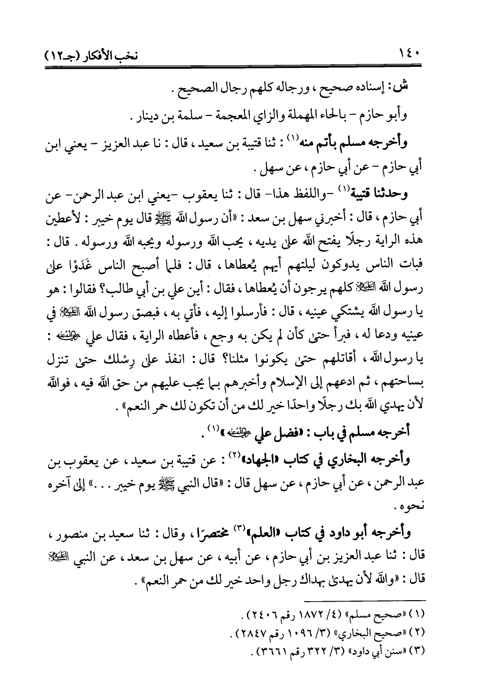 وأخرجه أبو داود في كتاب "العلم" (¬3) مختصرًا، وقال: ثنا سعيد بن منصور، قال: ثنا عبد العزيز بن أبي حازم، عن أبيه، عن سهل بن سعد، عن النبي -عليه السلام- قال: "والله لأن يهدى بهداك رجل واحد خير لك من حمر النعم".