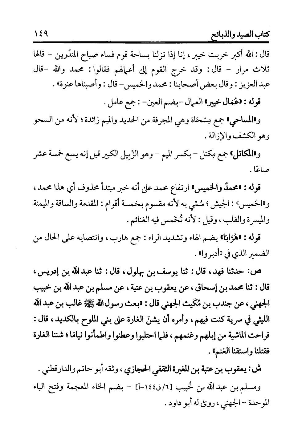 ص: حدثنا فهد، قال: ثنا يوسف بن بهلول، قال: ثنا عبد الله بن إدريس، قال: ثنا محمد بن إسحاق، عن يعقوب بن عتبة، عن مسلم بن عبد الله بن خبيب الجهني، عن جندب بن مُكَيث الجهني قال: "بعث رسول الله - صلى الله عليه وسلم - غالب بن عبد الله الليثي في سرية كنت فيهم، وأمره أن يشنّ الغارة على بني الملوح بالكديد، قال: فراحت الماشية من إبلهم وغنمهم، فلما احتلبوا وعطنوا واطمأنوا نيامًا؛ شننا الغارة فقتلنا واستقنا الغنم".