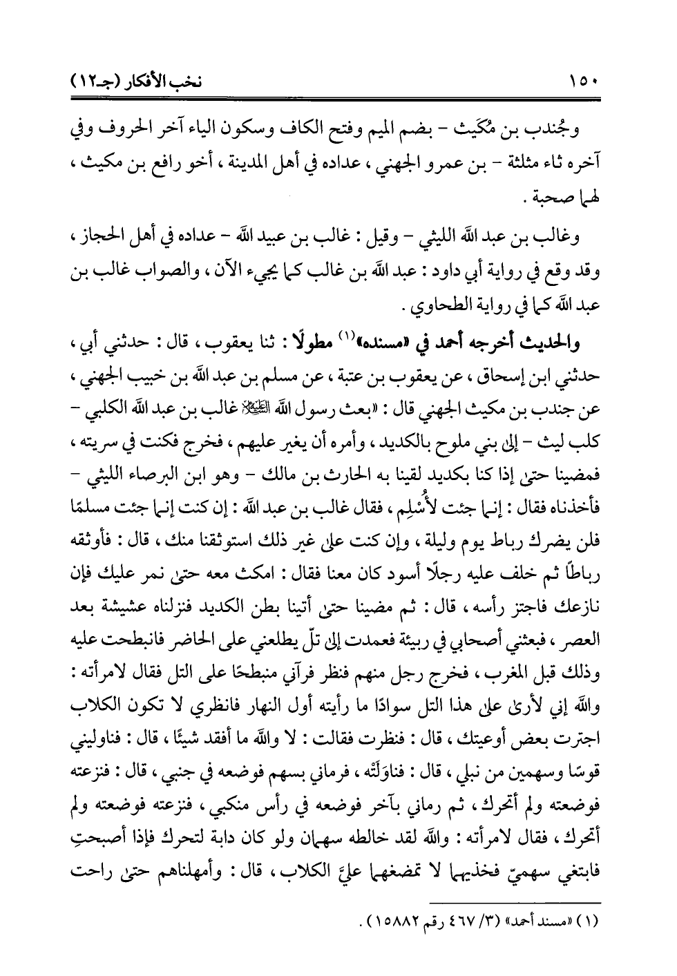 والحديث أخرجه أحمد في "مسنده" (¬1) مطولاً: ثنا يعقوب، قال: حدثني أبي، حدثني ابن إسحاق، عن يعقوب بن عتبة، عن مسلم بن عبد الله بن خبيب الجهني، عن جندب بن مكيث الجهني قال: "بعث رسول الله -عليه السلام- غالب بن عبد الله الكلبي -كلب ليث- إلى بني ملوح بالكديد، وأمره أن يغير عليهم، فخرج فكنت في سريته، فمضينا حتى إذا كنا بكديد لقينا به الحارث بن مالك -وهو ابن البرصاء الليثي- فأخذناه فقال: إنما جئت لأُسْلِم، فقال غالب بن عبد الله: إن كنت إنما جئت مسلمًا فلن يضرك رباط يوم وليلة، وإن كنت على غير ذلك استوثقنا منك، قال: فأوثقه رباطًا ثم خلف عليه رجلاً أسود كان معنا فقال: امكث معه حتى نمر عليك فإن نازعك فاجتز رأسه، قال: ثم مضينا حتى أتينا بطن الكديد فنزلناه عشيشة بعد العصر، فبعثني أصحابي في ربيئة فعمدت إلى تلّ يطلعني على الحاضر فانبطحت عليه وذلك قبل المغرب، فخرج رجل منهم فنظر فرآني منبطحًا على التل فقال لامرأته: والله إني لأرى على هذا التل سوادًا ما رأيته أول النهار فانظري لا تكون الكلاب اجترت بعض أوعيتك، قال: فنظرت فقالت: لا والله ما أفقد شيئًا، قال: فناوليني قوسًا وسهمين من نبلي، قال: فناوَلَتْه، فرماني بسهم فوضعه في جنبي، قال: فنزعته فوضعته ولم أتحرك، ثم رماني بآخر فوضعه في رأس منكبي، فنزعته فوضعته ولم أتحرك، فقال لامرأته: والله لقد خالطه سهمان ولو كان دابة لتحرك فإذا أصبحتِ فابتغي سهميّ فخذيهما لا تمضغهما عليَّ الكلاب، قال: وأمهلناهم حتى راحت