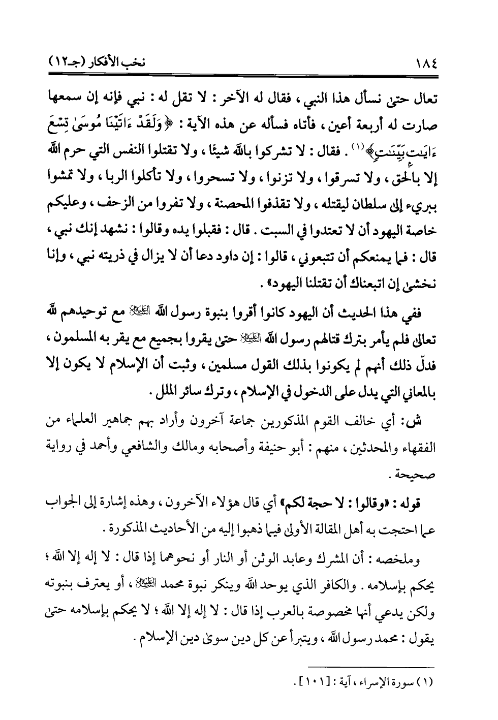 ففي هذا الحديث أن اليهود كانوا أقروا بنبوة رسول الله -عليه السلام- مع توحيدهم لله تعالى فلم يأمر بترك قتالهم رسول الله -عليه السلام- حتى يقروا بجميع مع يقر به المسلمون، فدلّ ذلك أنهم لم يكونوا بذلك القول مسلمين، وثبت أن الإِسلام لا يكون إلا بالمعاني التي يدل على الدخول في الإسلام، وترك سائر الملل.