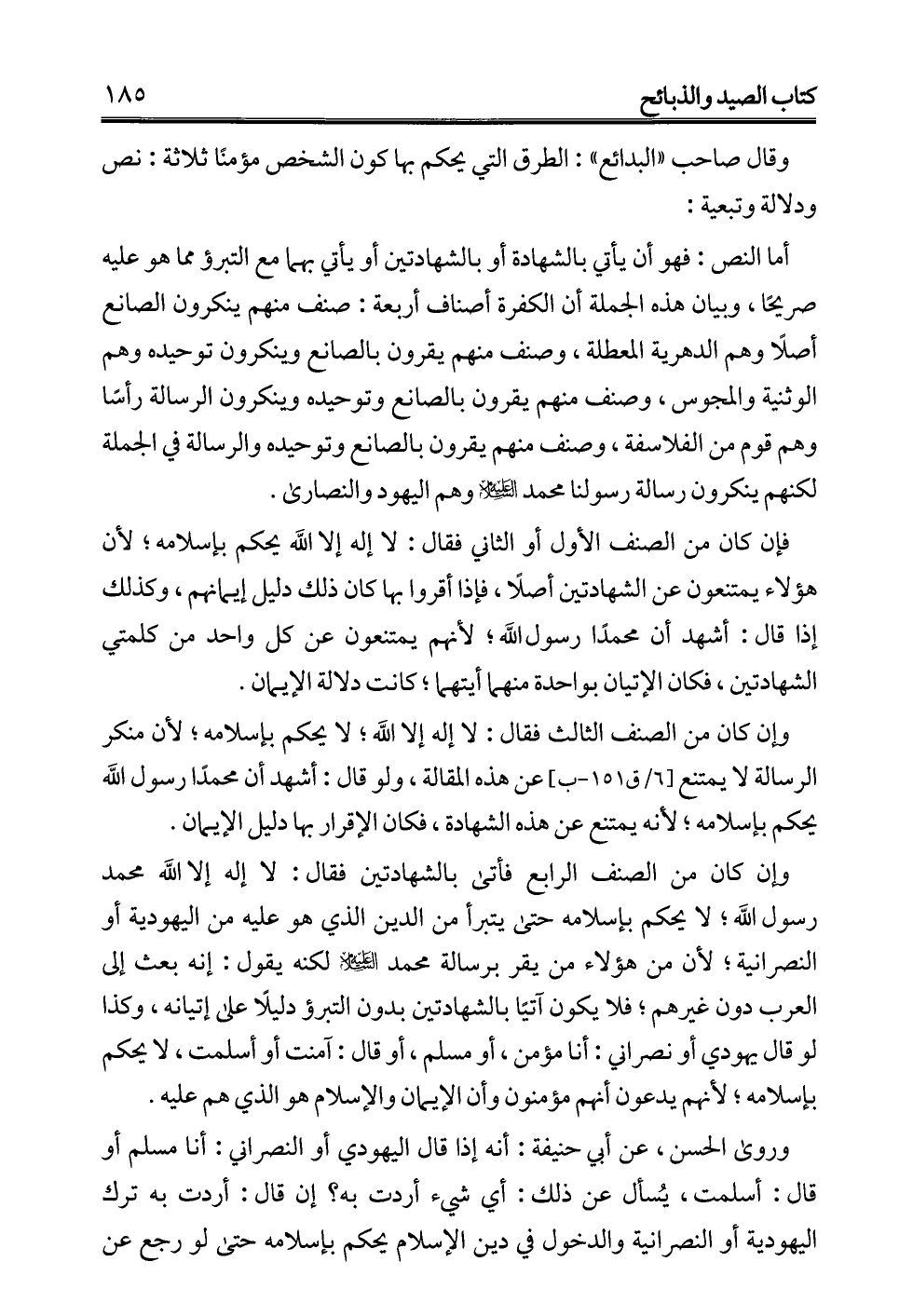 أما النص: فهو أن يأتي بالشهادة أو بالشهادتين أو يأتي بهما مع التبرؤ مما هو عليه صريحًا، وبيان هذه الجملة أن الكفرة أصناف أربعة: صنف منهم ينكرون الصانع أصلاً وهم الدهرية المعطلة، وصنف منهم يقرون بالصانع وينكرون توحيده وهم الوثنية والمجوس، وصنف منهم يقرون بالصانع وتوحيده وينكرون الرسالة رأسًا وهم قوم من الفلاسفة، وصنف منهم يقرون بالصانع وتوحيده والرسالة في الجملة لكنهم ينكرون رسالة رسولنا محمد -عليه السلام- وهم اليهود والنصارى.