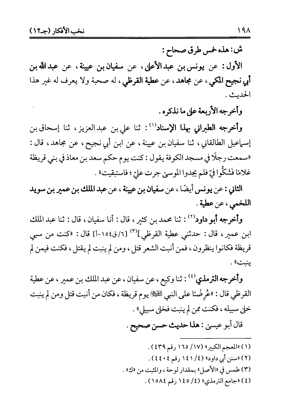 وأخرجه أبو داود (¬2): ثنا محمد بن كثير، قال: أنا سفيان، قال: ثنا عبد الملك ابن عمير، قال: حدثني عطية القرظي] (¬3) قال: "كنت من سبي قريظة فكانوا ينظرون، فمن أنبت الشعر قتل، ومن لم ينبت لم يقتل، فكنت فيمن لم ينبت".