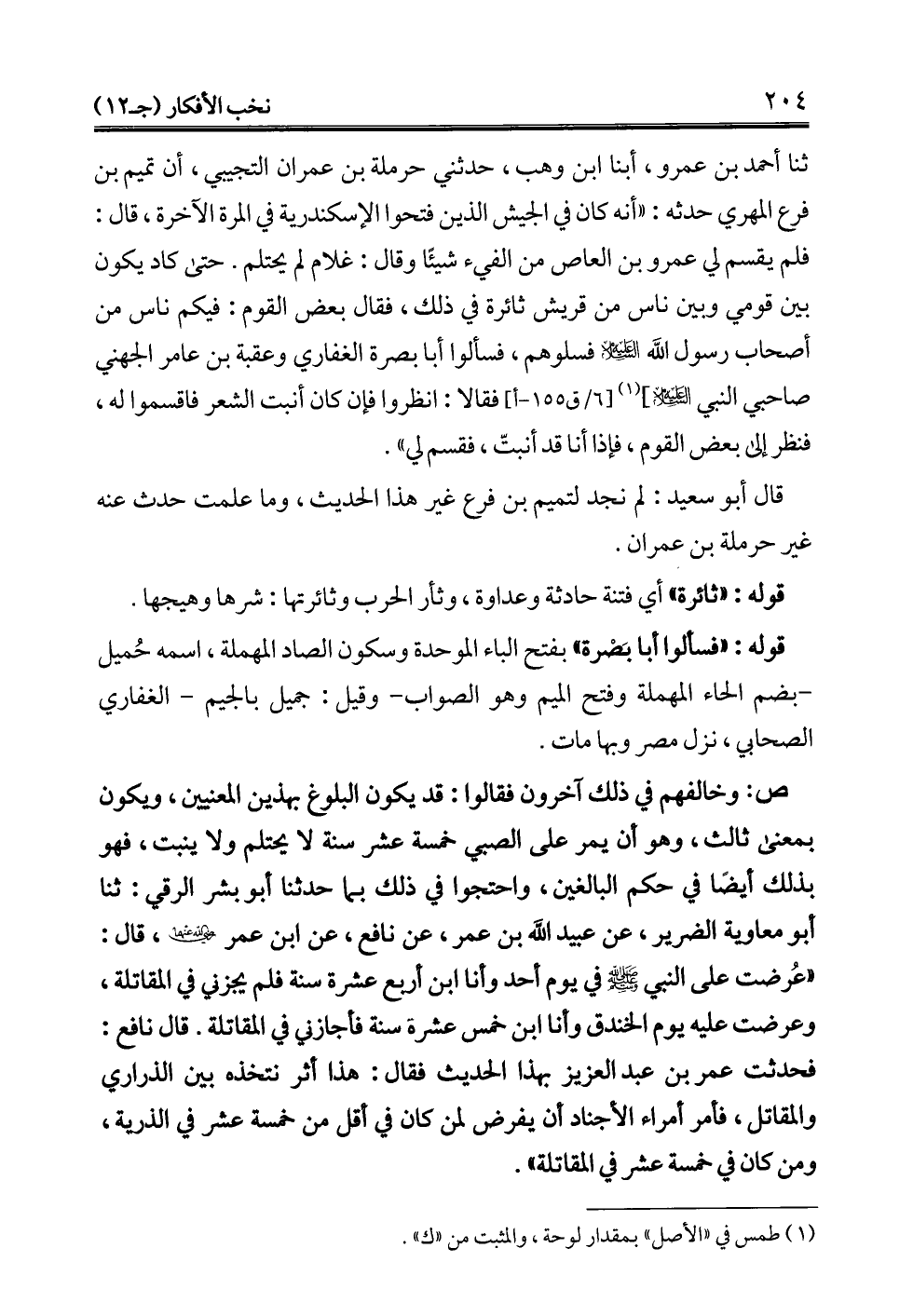 ص: وخالفهم في ذلك آخرون فقالوا: قد يكون البلوغ بهذين المعنيين، ويكون بمعنى ثالث، وهو أن يمر على الصبي خمسة عشر سنة لا يحتلم ولا ينبت، فهو بذلك أيضًا في حكم البالغين، واحتجوا في ذلك بما حدثنا أبو بشر الرقي: ثنا أبو معاوية الضرير، عن عبيد الله بن عمر، عن نافع، عن ابن عمر -رضي الله عنهما-، قال: "عُرضت على النبي - صلى الله عليه وسلم - في يوم أحد وأنا ابن أربع عشرة سنة فلم يجزني في المقاتلة، وعرضت عليه يوم الخندق وأنا ابن خمس عشرة سنة فأجازني في المقاتلة. قال نافع: فحدثت عمر بن عبد العزيز بهذا الحديث فقال: هذا أثر نتخذه بين الذراري والمقاتل، فأمر أمراء الأجناد أن يفرض لمن كان في أقل من خمسة عشر في الذرية، ومن كان في خمسة عشر في المقاتلة".