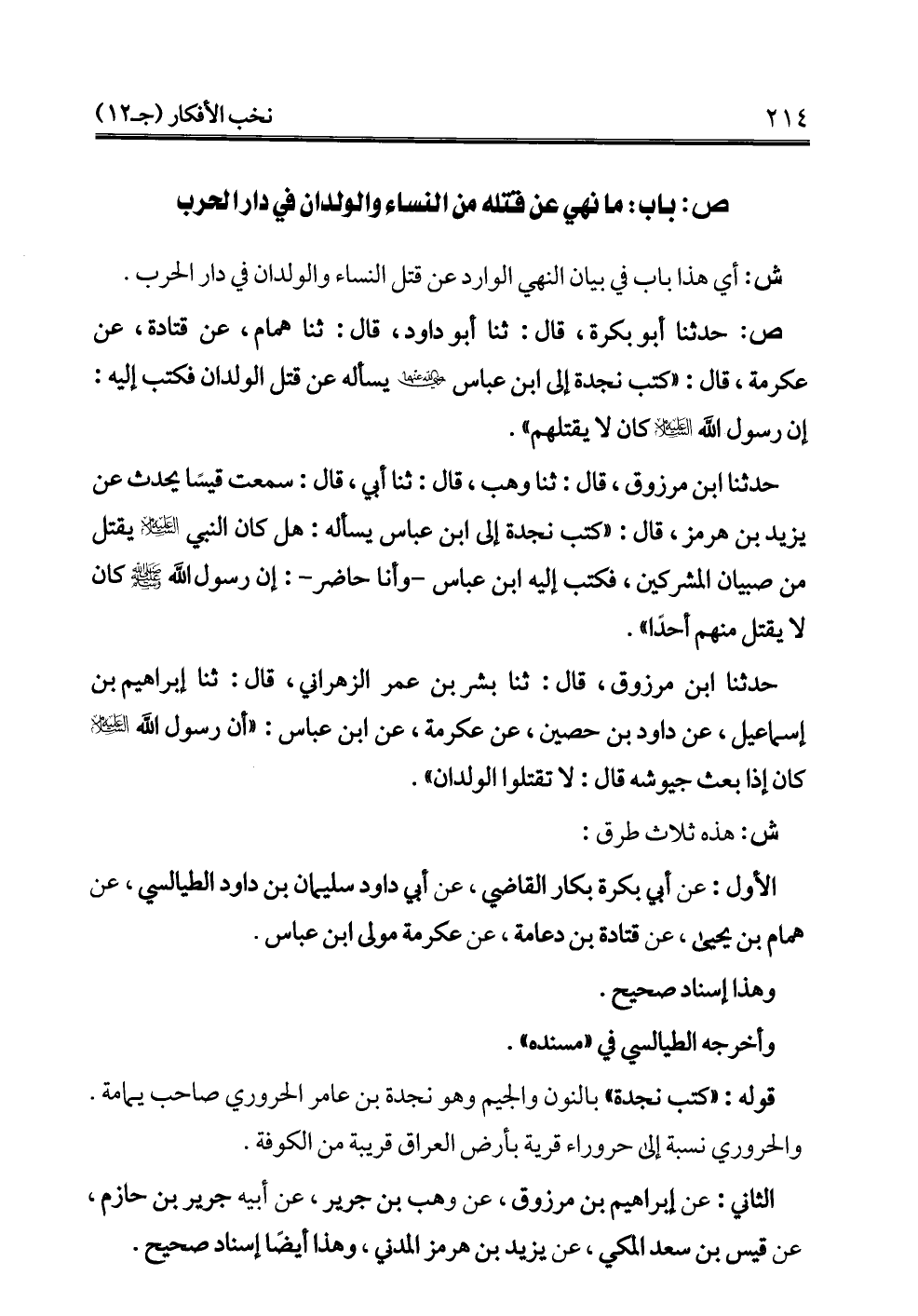 حدثنا ابن مرزوق، قال: ثنا وهب، قال: ثنا أبي، قال: سمعت قيسًا يحدث عن يزيد بن هرمز، قال: "كتب نجدة إلى ابن عباس يسأله: هل كان النبي -عليه السلام- يقتل من صبيان المشركين، فكتب إليه ابن عباس- وأنا حاضر-: إن رسول الله - صلى الله عليه وسلم - كان لا يقتل منهم أحدًا".