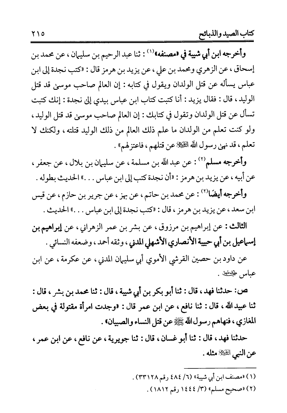 وأخرجه ابن أبي شيبة في "مصنفه" (¬1): ثنا عبد الرحيم بن سليمان، عن محمد بن إسحاق، عن الزهري ومحمد بن علي، عن يزيد بن هرمز قال: "كتب نجدة إلى ابن عباس يسأله عن قتل الولدان ويقول في كتابه: إن العالم صاحب موسى قد قتل الوليد، قال: فقال يزيد: أنا كتبت كتاب ابن عباس بيدي إلى نجدة: إنك كتبت تسأل عن قتل الولدان وتقول في كتابك: إن العالم صاحب موسى قد قتل الوليد، ولو كنت تعلم من الولدان ما علم ذلك العالم من ذلك الوليد قتلته، ولكنك لا تعلم، قد نهى رسول الله -عليه السلام- عن قتلهم، فاعتزلهم".