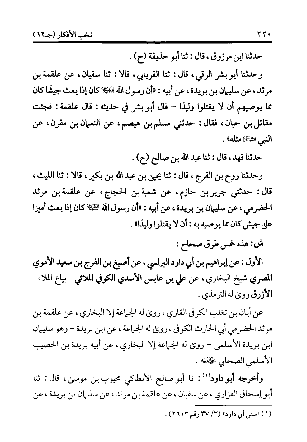 وأخرجه أبو داود (¬1): نا أبو صالح الأنطاكي محبوب بن موسى، قال: ثنا أبو إسحاق الفزاري، عن سفيان، عن علقمة بن مرثد، عن سليمان بن بريدة، عن