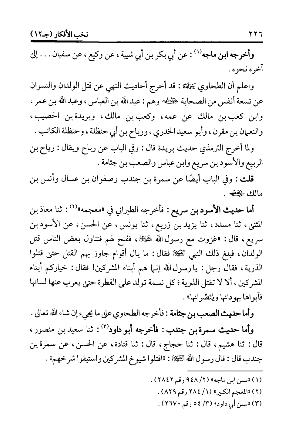 واعلم أن الطحاوي -رحمه الله-: قد أخرج أحاديث النهي عن قتل الولدان والنسوان عن تسعة أنفس من الصحابة -رضي الله عنهم- وهم: عبد الله بن العباس، وعبد الله بن عمر، وابن كعب بن مالك عن عمه، وكعب بن مالك، وبريدة بن الحصيب، والنعمان بن مقرن، وأبو سعيد الخدري، ورباح بن أبي حنظلة، وحنظلة الكاتب.