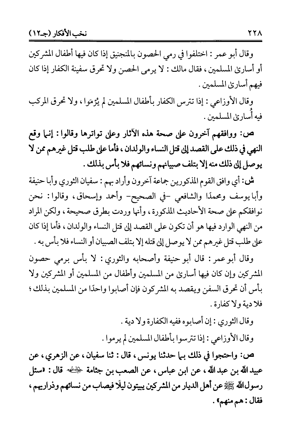 ش: أي وافق القوم المذكورين جماعة آخرون وأراد بهم: سفيان الثوري وأبا حنيفة وأبا يوسف ومحمدًا والشافعي -في الصحيح- وأحمد وإسحاق، وقالوا: نحن نوافقكم على صحة الأحاديث المذكورة، وأنها وردت بطرق صحيحة، ولكن المراد من النهي الوارد فيها هو أن تكون على القصد إلى قتل النساء والولدان، فأما إذا كان على طلب قتل غيرهم ممن لا يوصل إلى قتله إلا بتلف الصبيان أو النساء فلا بأس به.