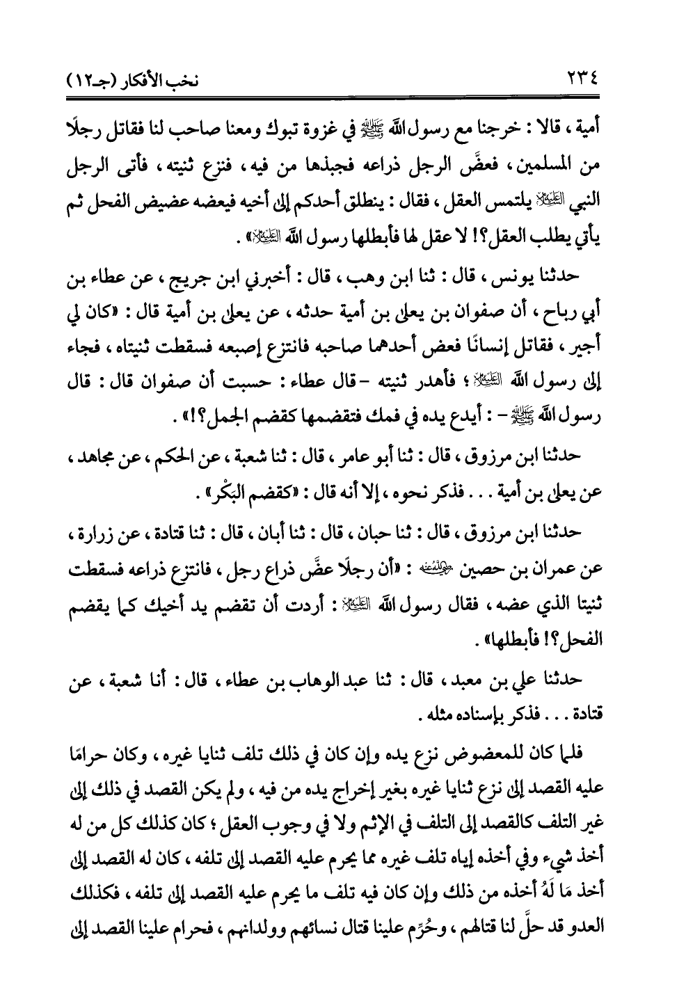 أمية، قالا: خرجنا مع رسول الله - صلى الله عليه وسلم - في غزوة تبوك ومعنا صاحب لنا فقاتل رجلاً من المسلمين، فعضَّ الرجل ذراعه فجبذها من فيه، فنزع ثنيته، فأتى الرجل النبي -عليه السلام- يلتمس العقل، فقال: ينطلق أحدكم إلى أخيه فيعضه عضيض الفحل ثم يأتي يطلب العقل؟! لا عقل لها فأبطلها رسول الله -عليه السلام-".