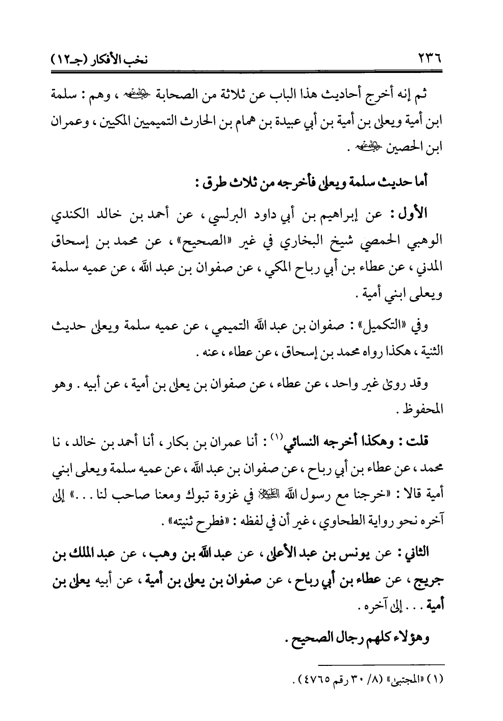 ثم إنه أخرج أحاديث هذا الباب عن ثلاثة من الصحابة -رضي الله عنهم-، وهم: سلمة ابن أمية ويعلى بن أمية بن أبي عبيدة بن همام بن الحارث التميميين المكيين، وعمران ابن الحصين -رضي الله عنهم-.