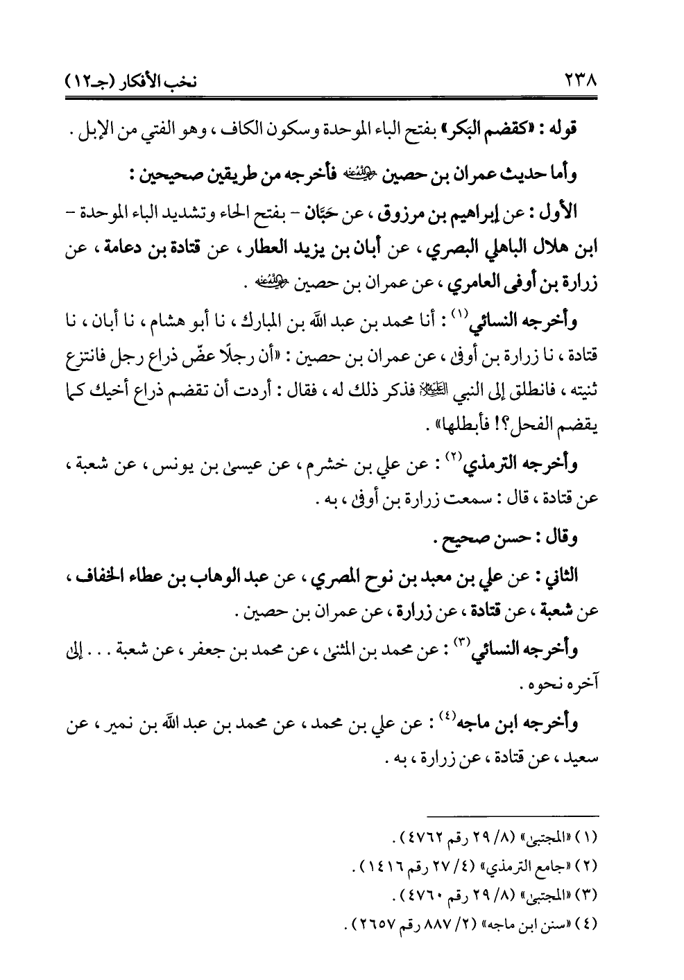 وأخرجه النسائي (¬1): أنا محمد بن عبد الله بن المبارك، نا أبو هشام، نا أبان، نا قتادة، نا زرارة بن أوفى، عن عمران بن حصين: "أن رجلاً عضّ ذراع رجل فانتزع ثنيته، فانطلق إلى النبي -عليه السلام- فذكر ذلك له، فقال: أردت أن تقضم ذراع أخيك كما يقضم الفحل؟! فأبطلها".