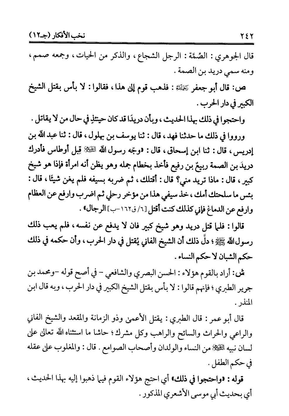 ش: أراد بالقوم هؤلاء: الحسن البصري والشافعي -في أصح قوله- ومحمد بن جرير الطبري؛ فإنهم قالوا: لا بأس بقتل الشيخ الكبير في دار الحرب، وبه قال ابن المنذر.