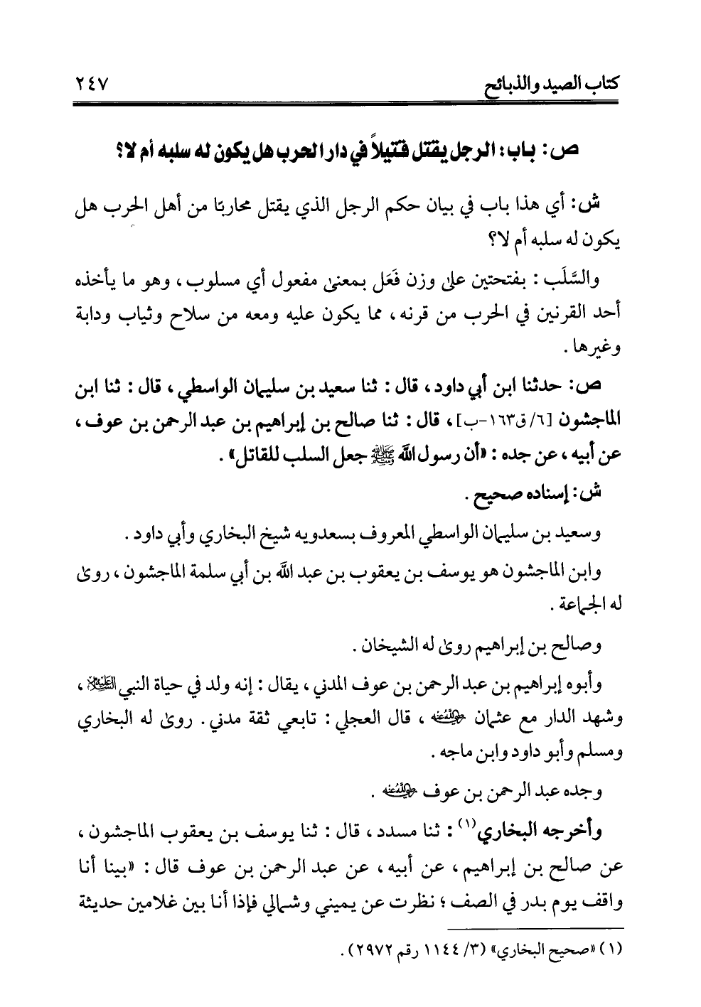 ص: حدثنا ابن أبي داود، قال: ثنا سعيد بن سليمان الواسطي، قال: ثنا ابن الماجشون, قال: ثنا صالح بن إبراهيم بن عبد الرحمن بن عوف، عن أبيه، عن جده: "أن رسول الله - صلى الله عليه وسلم - جعل السلب للقاتل".