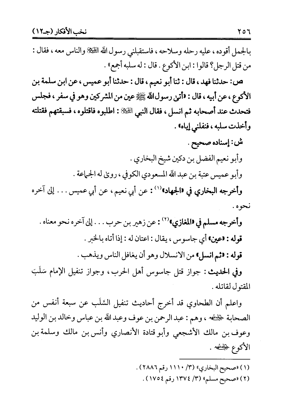ص: حدثنا فهد، قال: ثنا أبو نعيم، قال: حدثنا أبو عميس، عن ابن سلمة بن الأكوع، عن أبيه، قال: "أتى رسول الله - صلى الله عليه وسلم - عين من المشركين وهو في سفر، فجلس فتحدث عند أصحابه ثم انسل، فقال النبي -عليه السلام-: اطلبوه فاقتلوه، فسبقتهم فقتلته وأخذت سلبه، فنفلني إياه".