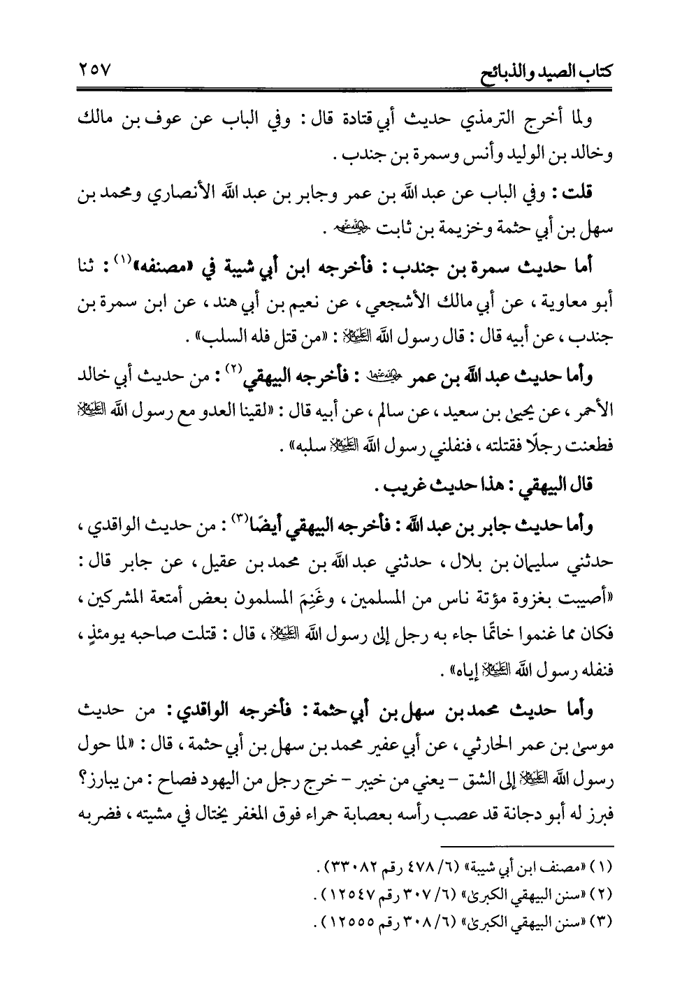 أما حديث سمرة بن جندب: فأخرجه ابن أبي شيبة في "مصنفه" (¬1): ثنا أبو معاوية، عن أبي مالك الأشجعي، عن نعيم بن أبي هند، عن ابن سمرة بن جندب، عن أبيه قال: قال رسول الله -عليه السلام-: "من قتل فله السلب".