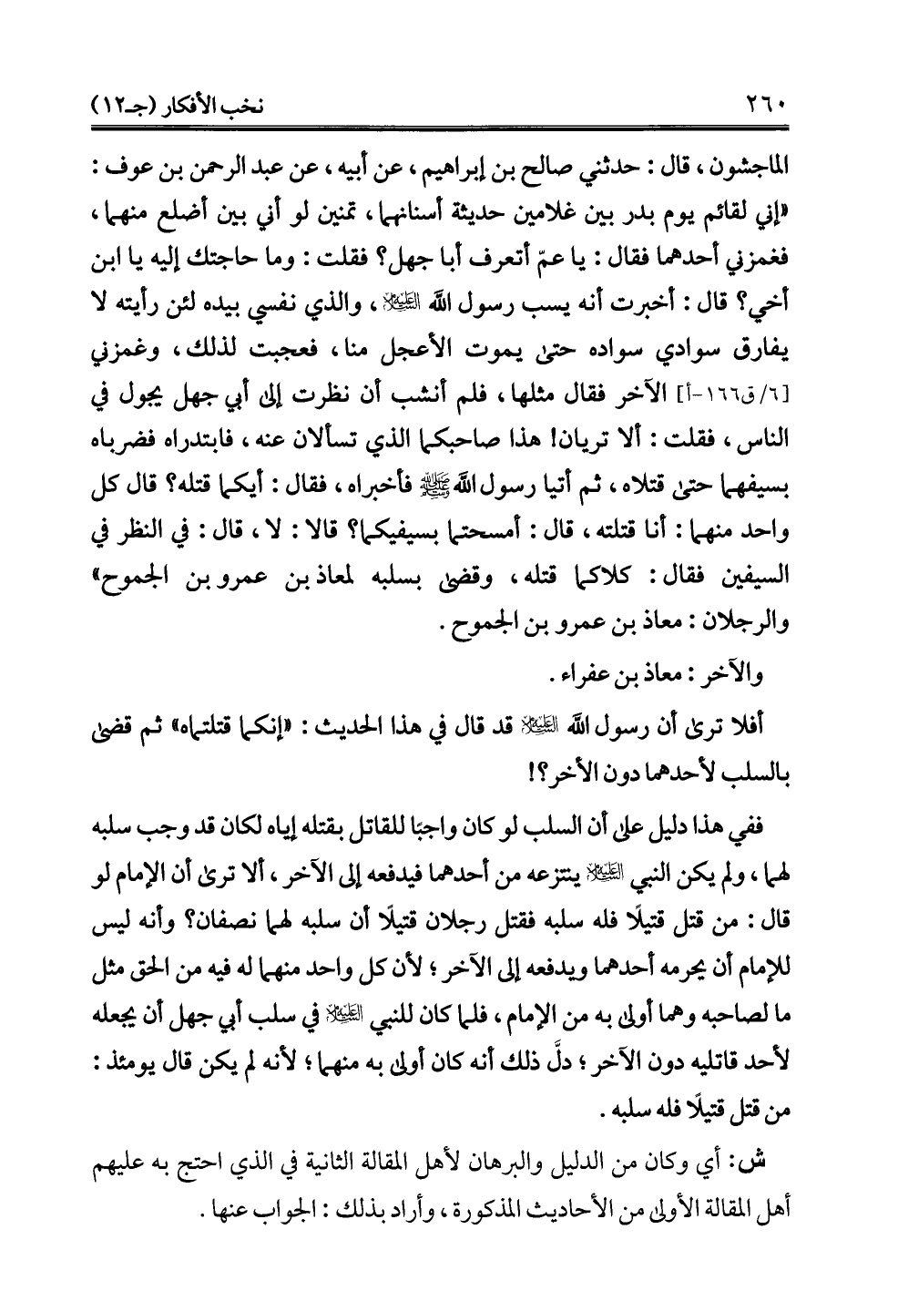 ففي هذا دليل على أن السلب لو كان واجبًا للقاتل بقتله إياه لكان قد وجب سلبه لهما، ولم يكن النبي -عليه السلام- ينتزعه من أحدهما فيدفعه إلى الآخر، ألا ترى أن الإِمام لو قال: من قتل قتيلاً فله سلبه فقتل رجلان قتيلاً أن سلبه لهما نصفان؟ وأنه ليس للإِمام أن يحرمه أحدهما ويدفعه إلى الآخر؛ لأن كل واحد منهما له فيه من الحق مثل ما لصاحبه وهما أولى به من الإِمام، فلما كان للنبي -عليه السلام- في سلب أبي جهل أن يجعله لأحد قاتليه دون الآخر؛ دلَّ ذلك أنه كان أولى به منهما؛ لأنه لم يكن قال يومئذ: من قتل قتيلاً فله سلبه.